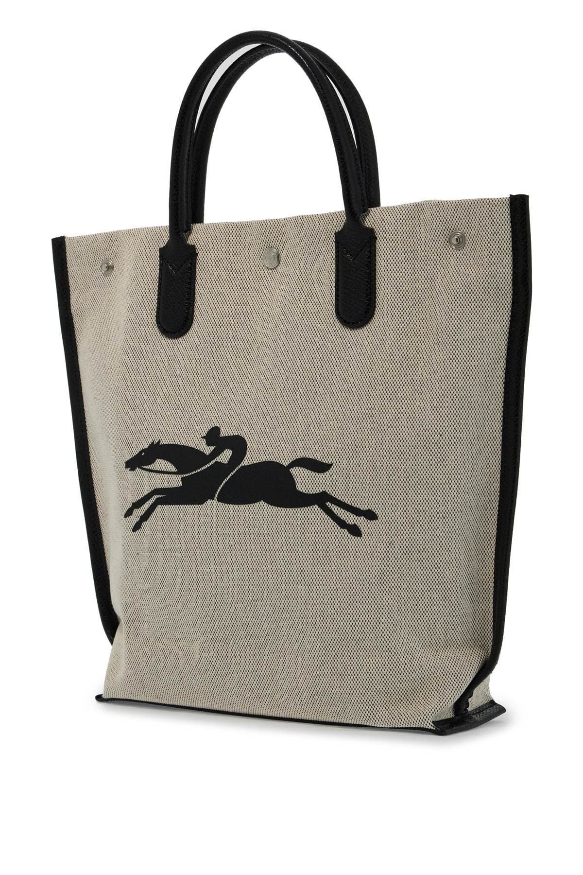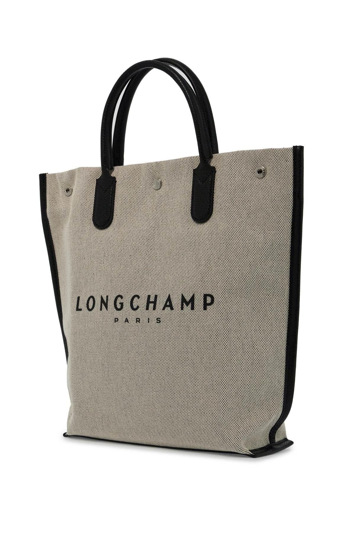 The Longchamp M Essential tote bag is made of cotton canvas with contrasting leather trims, base and handles. Logos are printed on both sides, with magnetic button closure and interior featuring one open pocket and one zippered pocket. Metallic accessories have a silver finish.