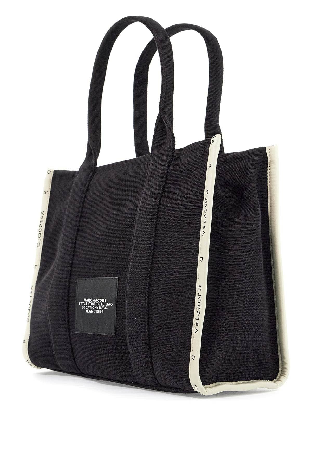 The Jacquard Traveler Tote Large bag by Marc Jacobs in cotton canvas featuring double handle, ribbons applied on the edges, and jacquard embroidery with logo on the front. Logo patch applied on the back, top zip closure, side handle. Unlined interior with one zip pocket and two small pockets, steel-finish metal hardware.