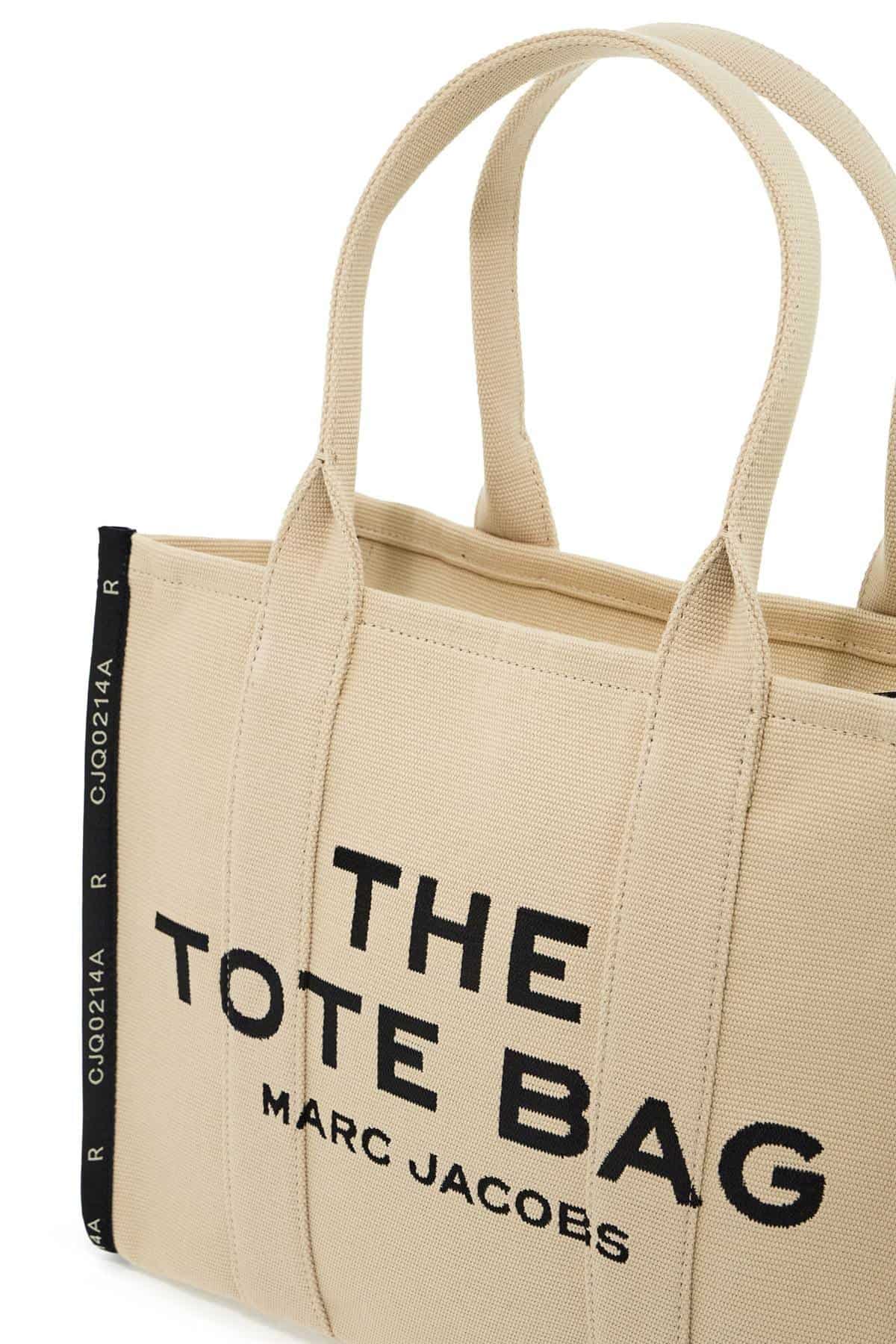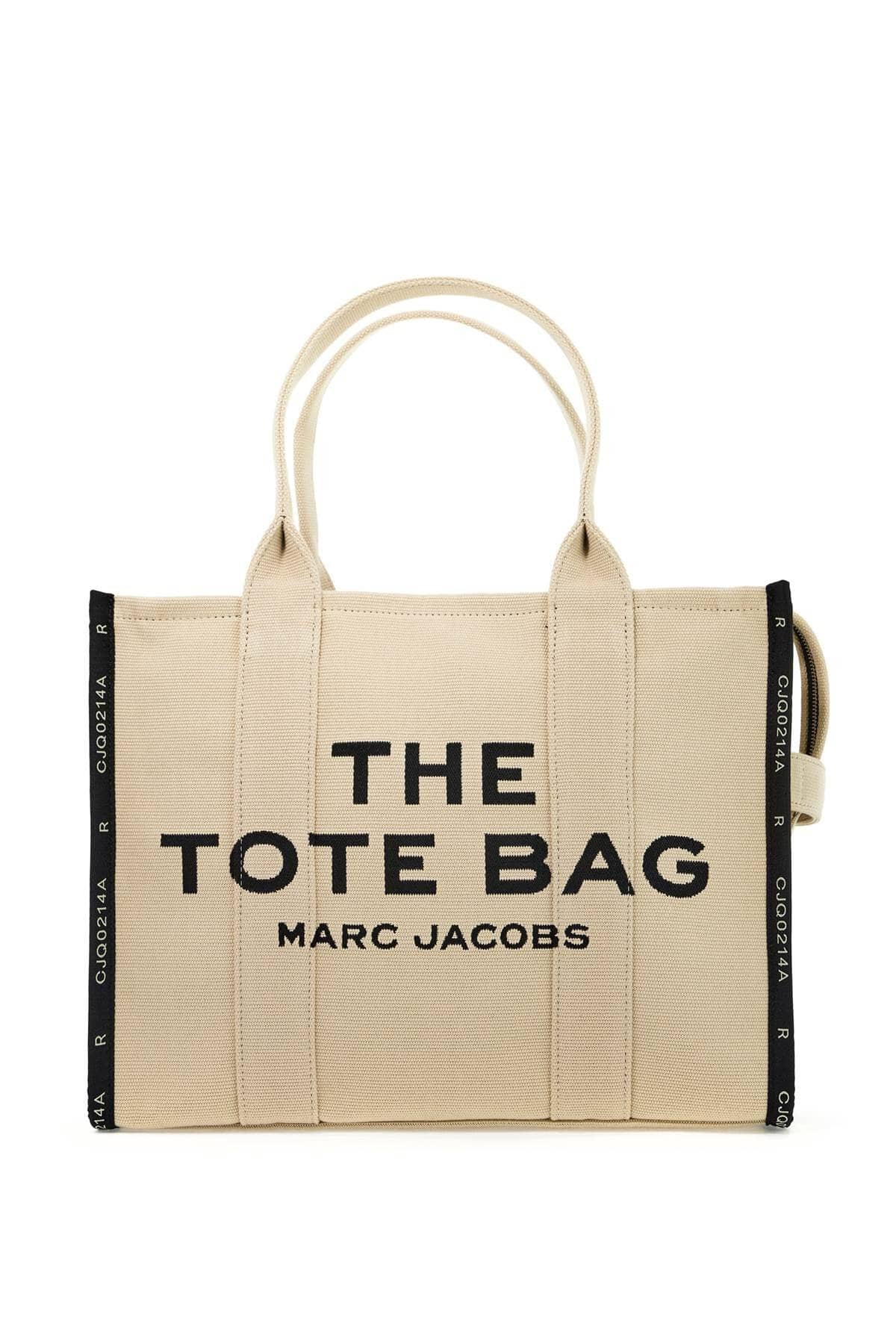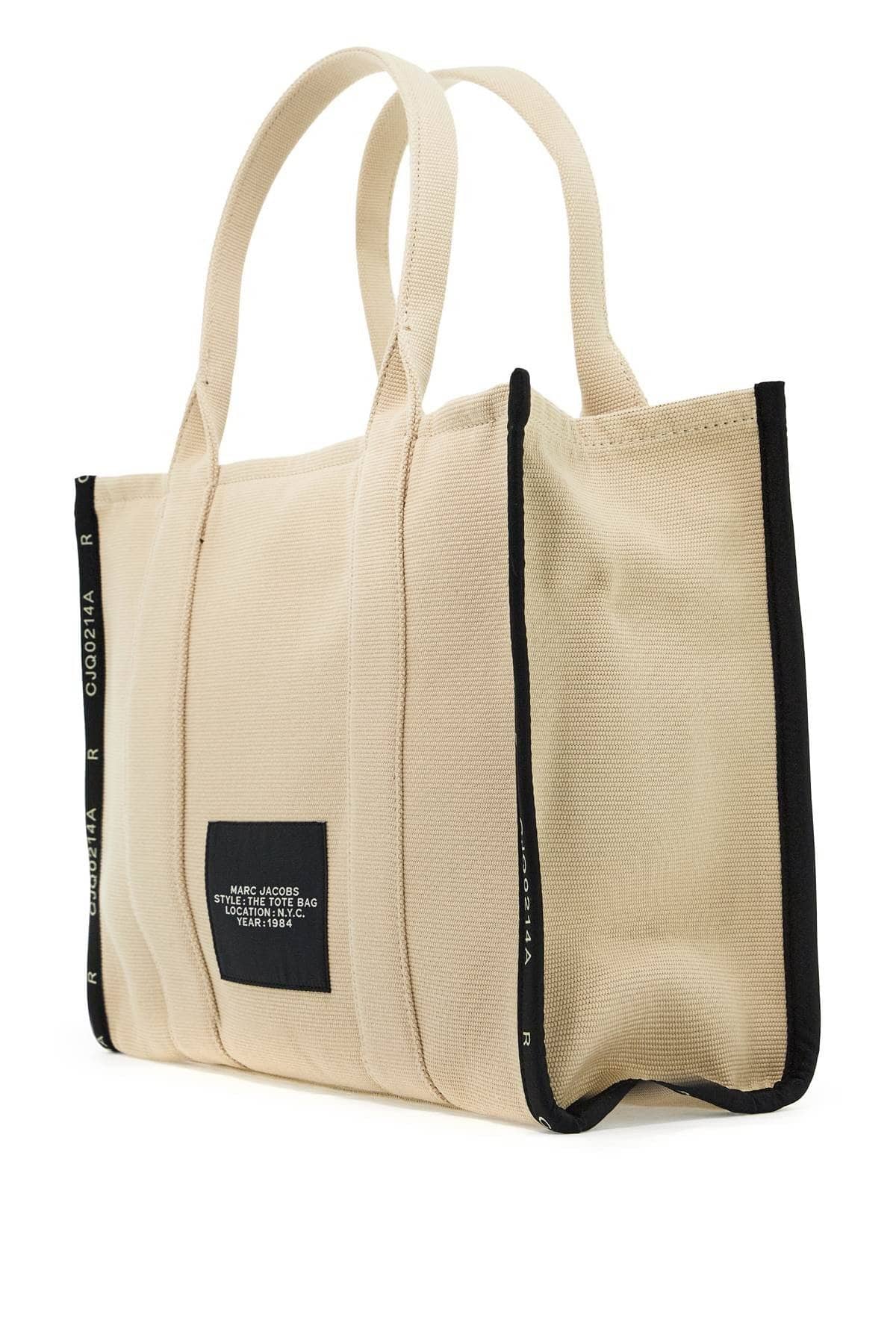 The Jacquard Traveler Tote Large bag by Marc Jacobs in cotton canvas featuring double handle, ribbons applied on the edges, and jacquard embroidery with logo on the front. Logo patch applied on the back, top zip closure, side handle. Unlined interior with one zip pocket and two small pockets, steel-finish metal hardware.