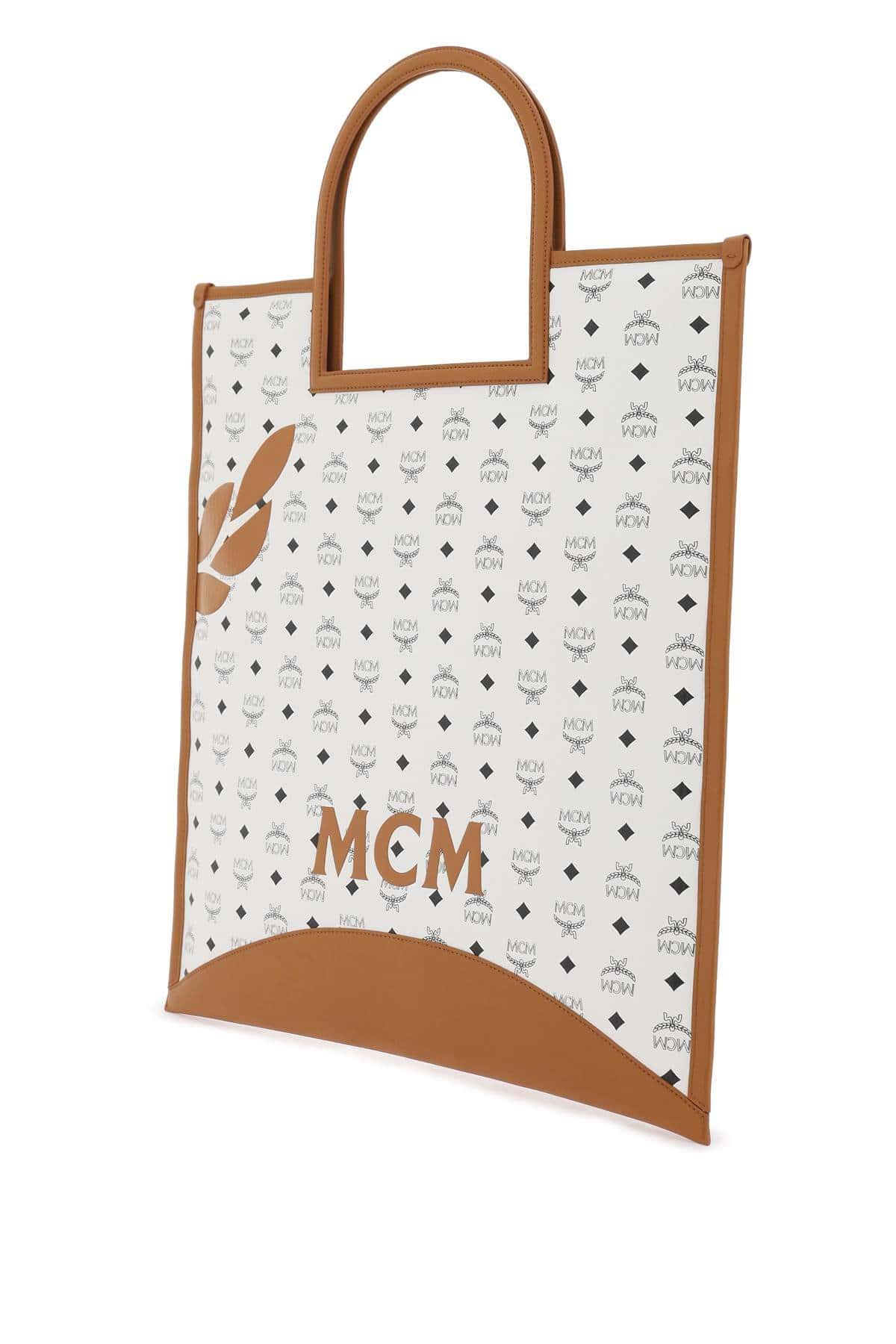 The MCM flat tote bag is made of iconic Visetos coated canvas with a contrasting Laurel logo. It features leather handles and details, a magnetic closure, and a microfiber suede interior with one zip pocket and two open pockets. The bag can be folded for a handheld look.