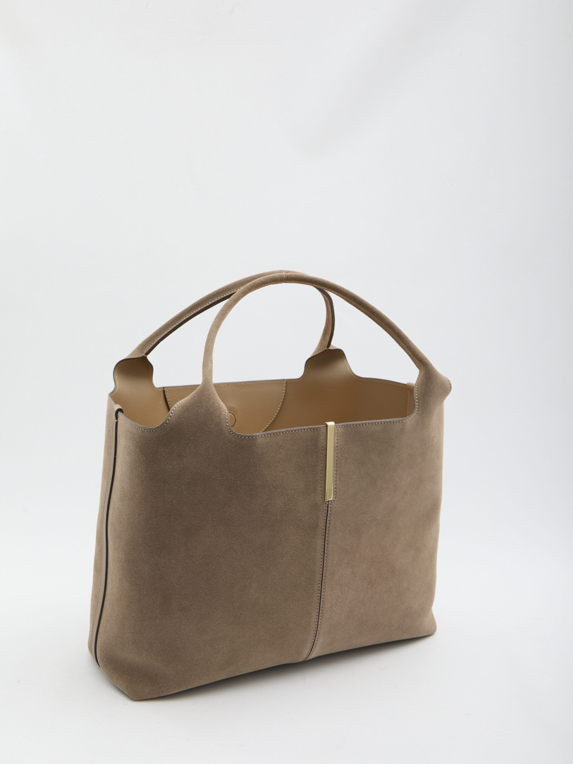 Taupe suede calfskin shopping bag. Features two top handles, magnetic closure, visible central stitching with a metal bar accessory with logo on the front, suede lining, a single internal compartment and metal feet on the bottom. Dust bag included. Any leather imperfections are not to be considered manufacturing defects, but a characteristic of the material.