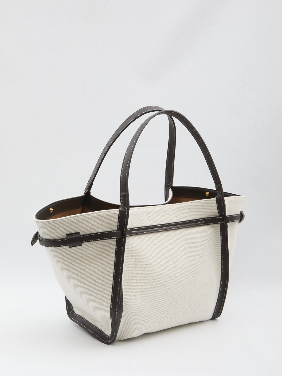 White mixed linen canvas shopping bag with smooth brown leather inserts. It features two fixed top handles, an adjustable external strap, a custom metal T Timeless accessory, metal feet, a hook closure with the Tod’s signature embossed, snap buttons to adjust the silhouette, one main compartment, an internal zip pocket, and a suede leather lining. Dustbag included. Any imperfections in the leather should not be considered manufacturing defects but rather a characteristic of the material.