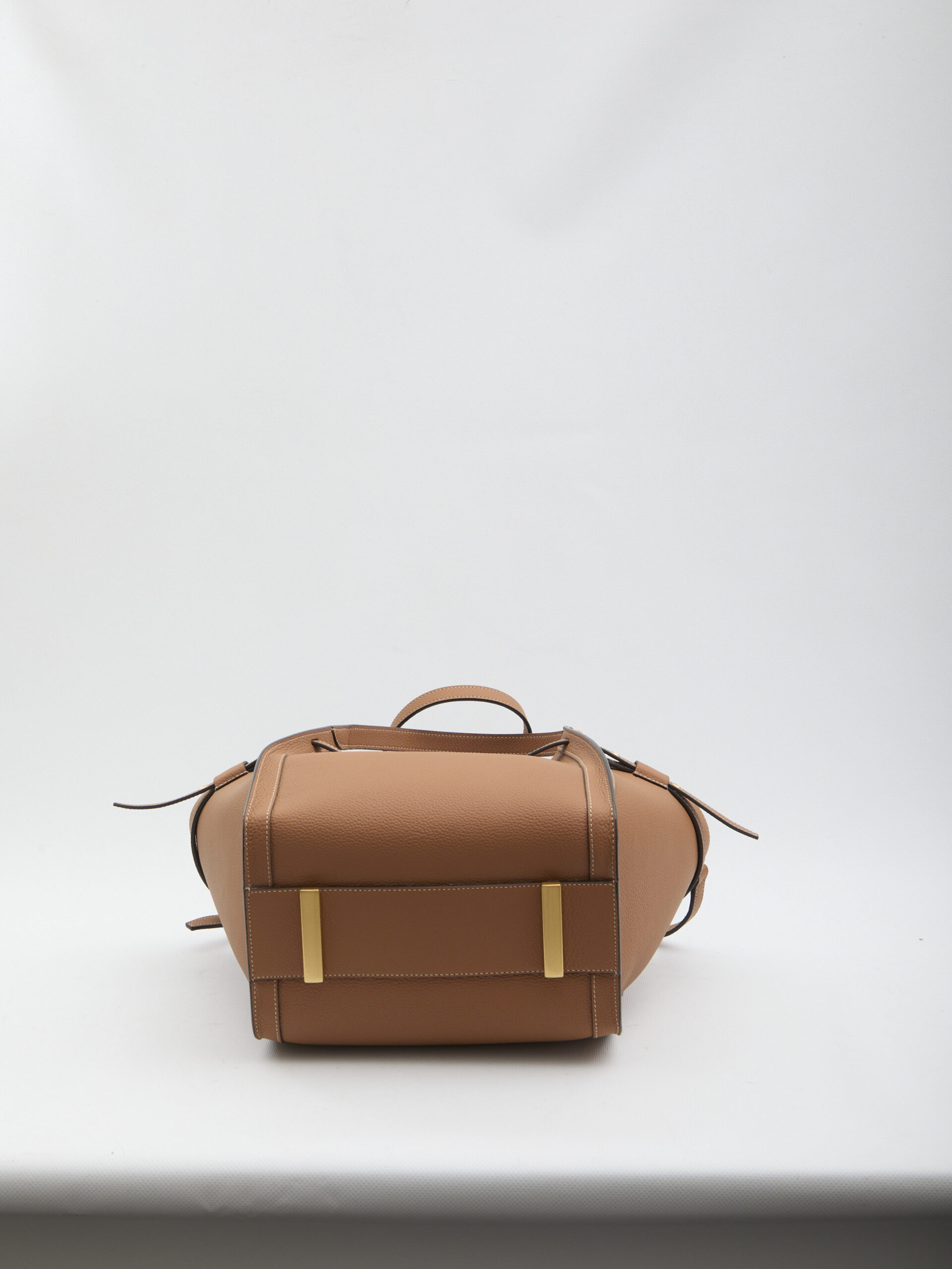 Brown grained calf leather bag. It features two top handles, an adjustable and removable shoulder strap, an adjustable external strap, a custom metal T Timeless accessory, metal feet, a hook closure with the Tod’s signature embossed, snap buttons to adjust the silhouette, one main compartment, an internal zip pocket, and a suede leather lining. Dustbag included. Any imperfections in the leather should not be considered manufacturing defects but rather a characteristic of the material.