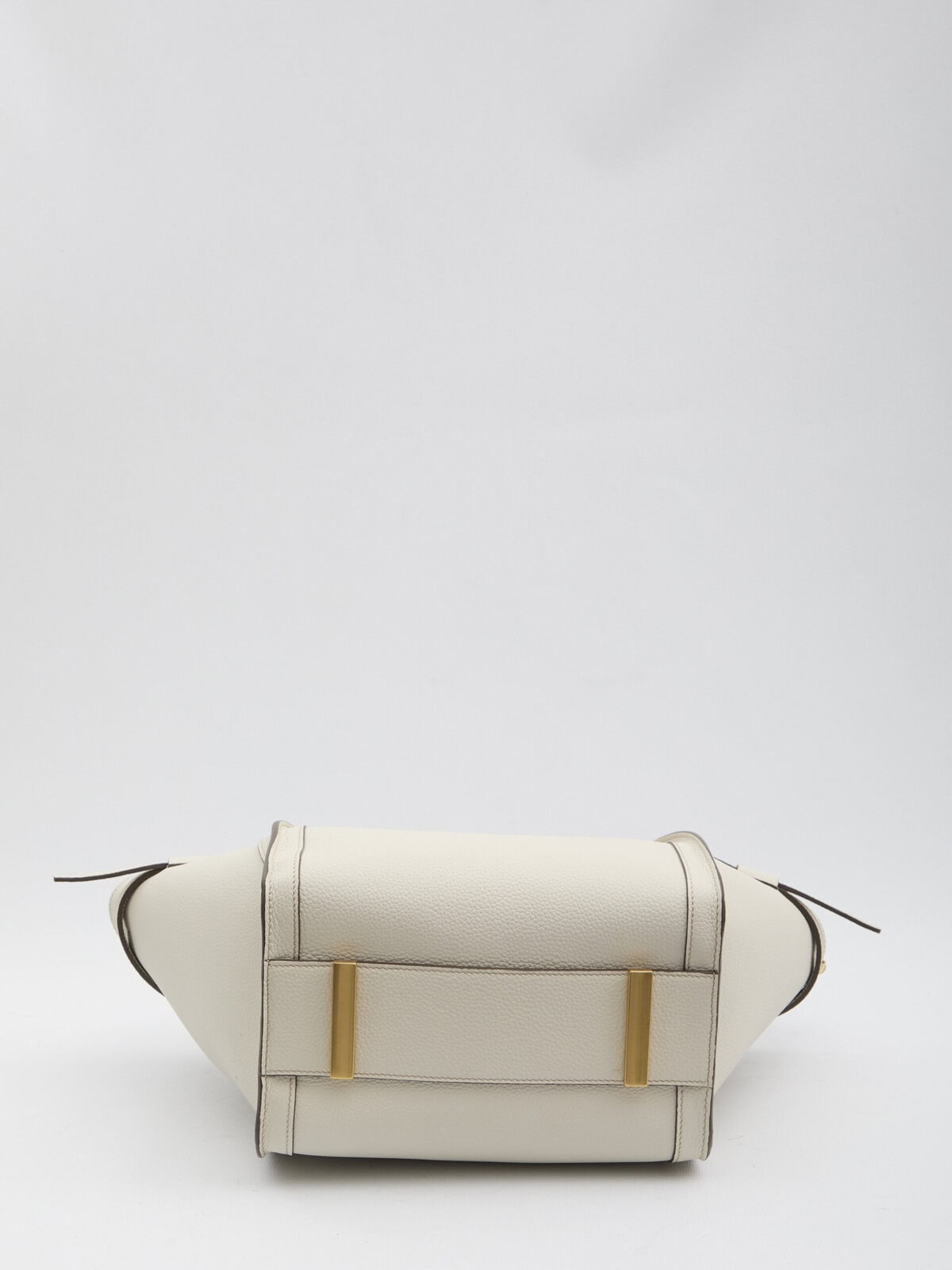 White grained calf leather bag. It features two top handles, an adjustable and removable shoulder strap, an adjustable external strap, a custom metal T Timeless accessory, metal feet, a hook closure with the Tod’s signature embossed, snap buttons to adjust the silhouette, one main compartment, an internal zip pocket, and a suede leather lining. Dustbag included. Any imperfections in the leather should not be considered manufacturing defects but rather a characteristic of the material.