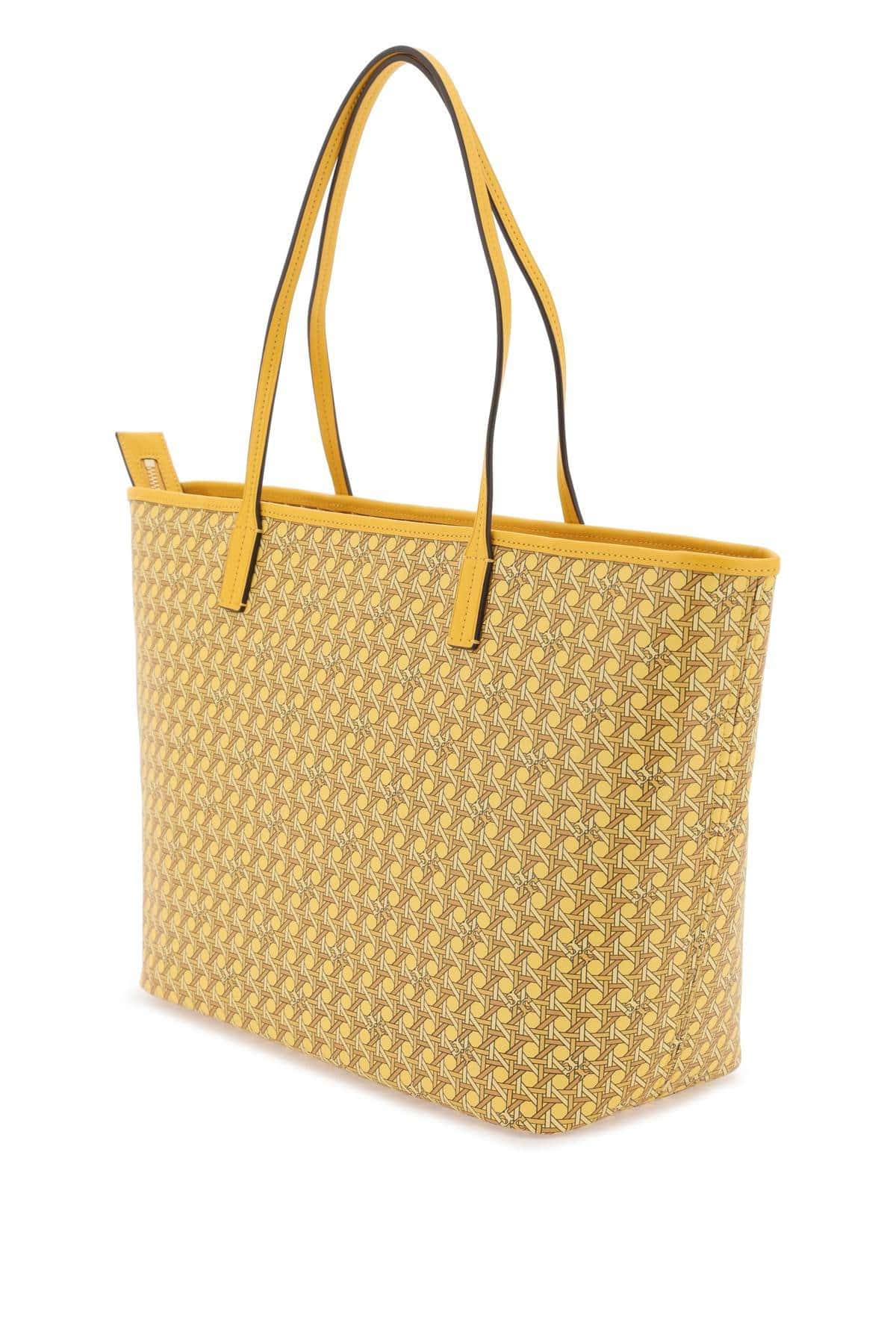 Tory Burch shopping bag made of water-repellent coated canvas, decorated with all-over monogram print. Zippered closure, inside zipper pocket, removable interior pouch. Finished with leather trims and double shoulder handle, brass details.