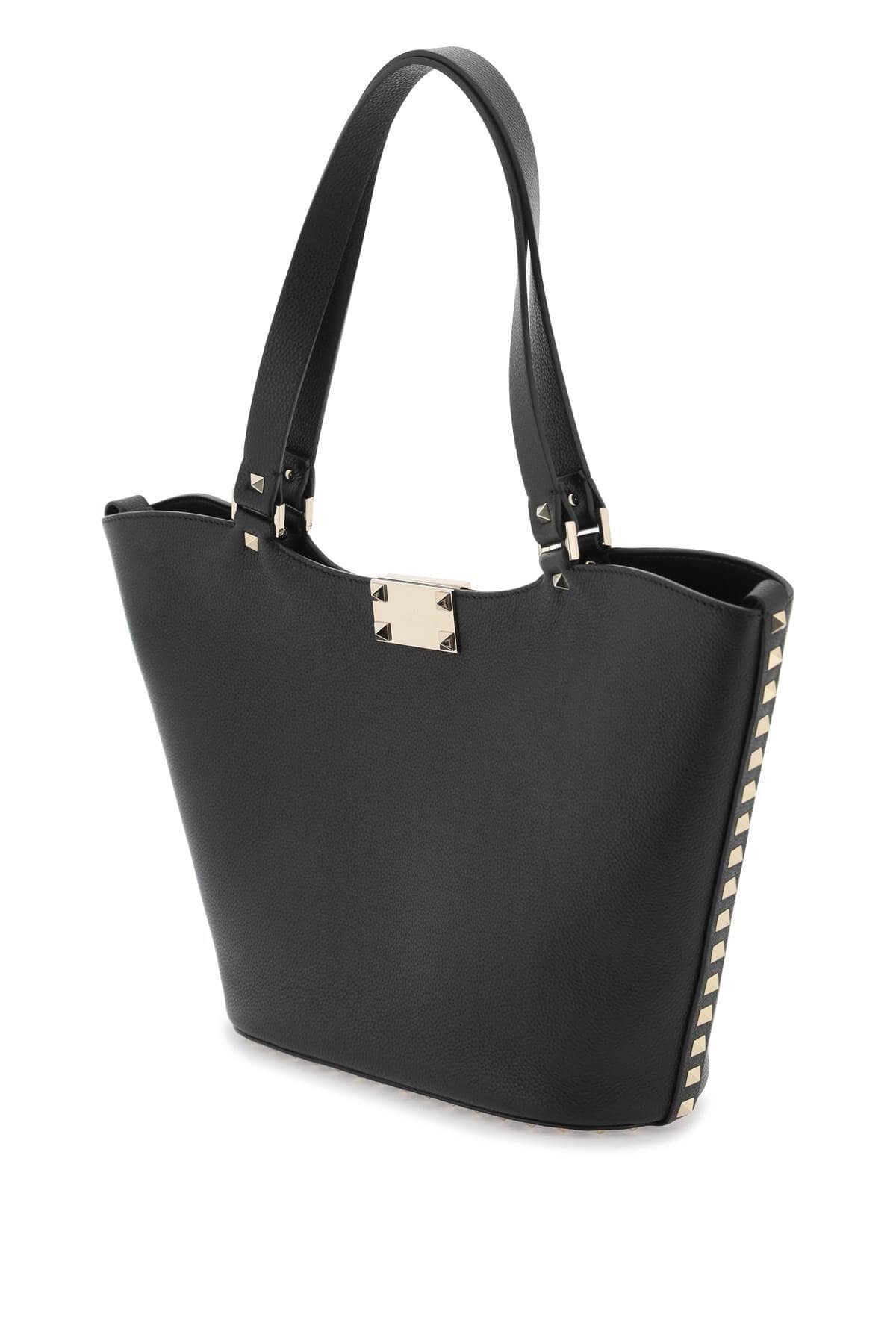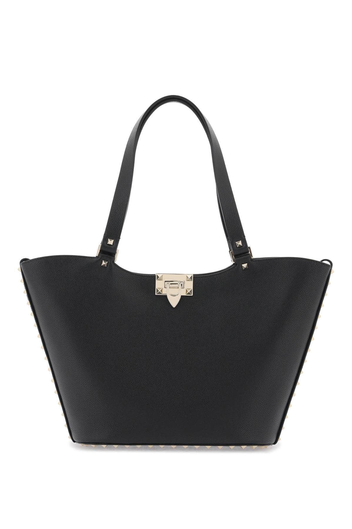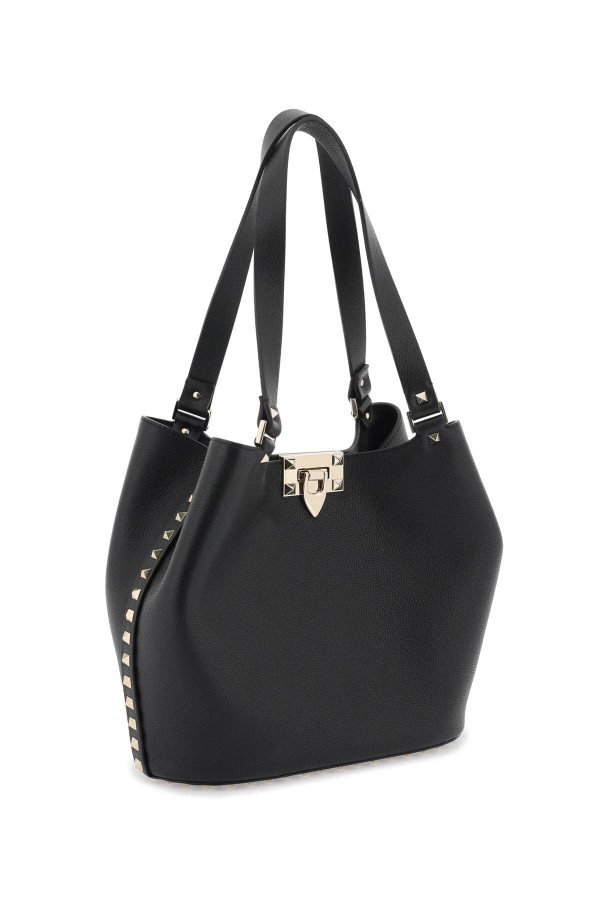 This Valentino Garavani tote bag is made of hammered leather and embellished with iconic platinum studs on the edges and base. It features a double handle, a hook closure, and a smooth leather interior with an open pocket and a carabiner to adjust the width.