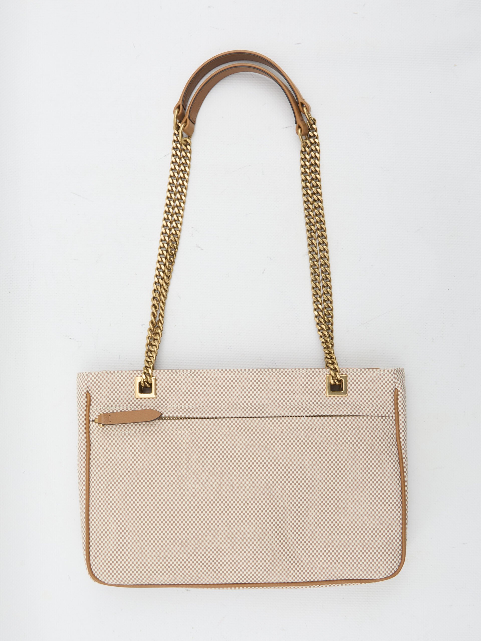 Small Viva Superstar shopping bag in white and brown canvas with brown leather trims. It features a maxi VLogo Signature in brown leather on the front, a sliding chain strap with leather handles, an external flat pocket with zip, a zip closure, and a single internal compartment. Dust bag included. Any imperfections in the leather should not be considered factory defects but rather a characteristic of the material.