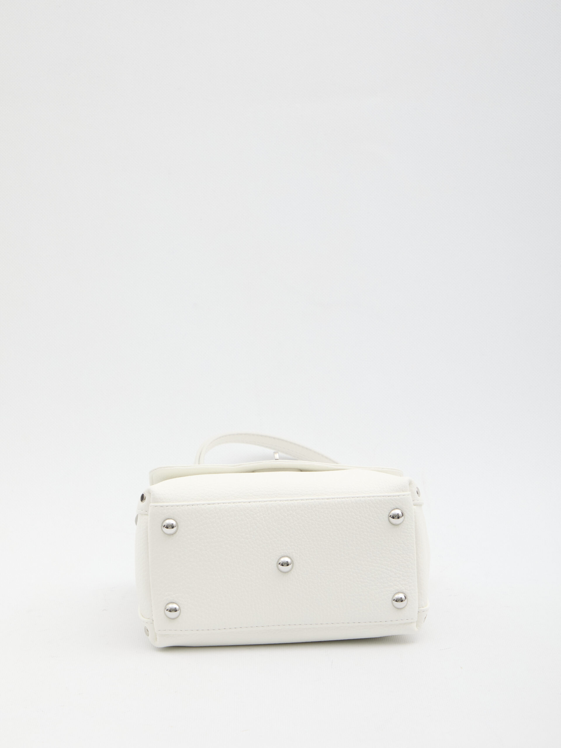 Milk white hammered calf leather bag. It features a fixed top handle, an adjustable and removable shoulder strap, a double turn-lock closure, metal feet, one main compartment, one internal flat pocket, and a cotton lining. Dustbag included. Any imperfections in the leather are not to be considered manufacturing defects, but a characteristic of the material.