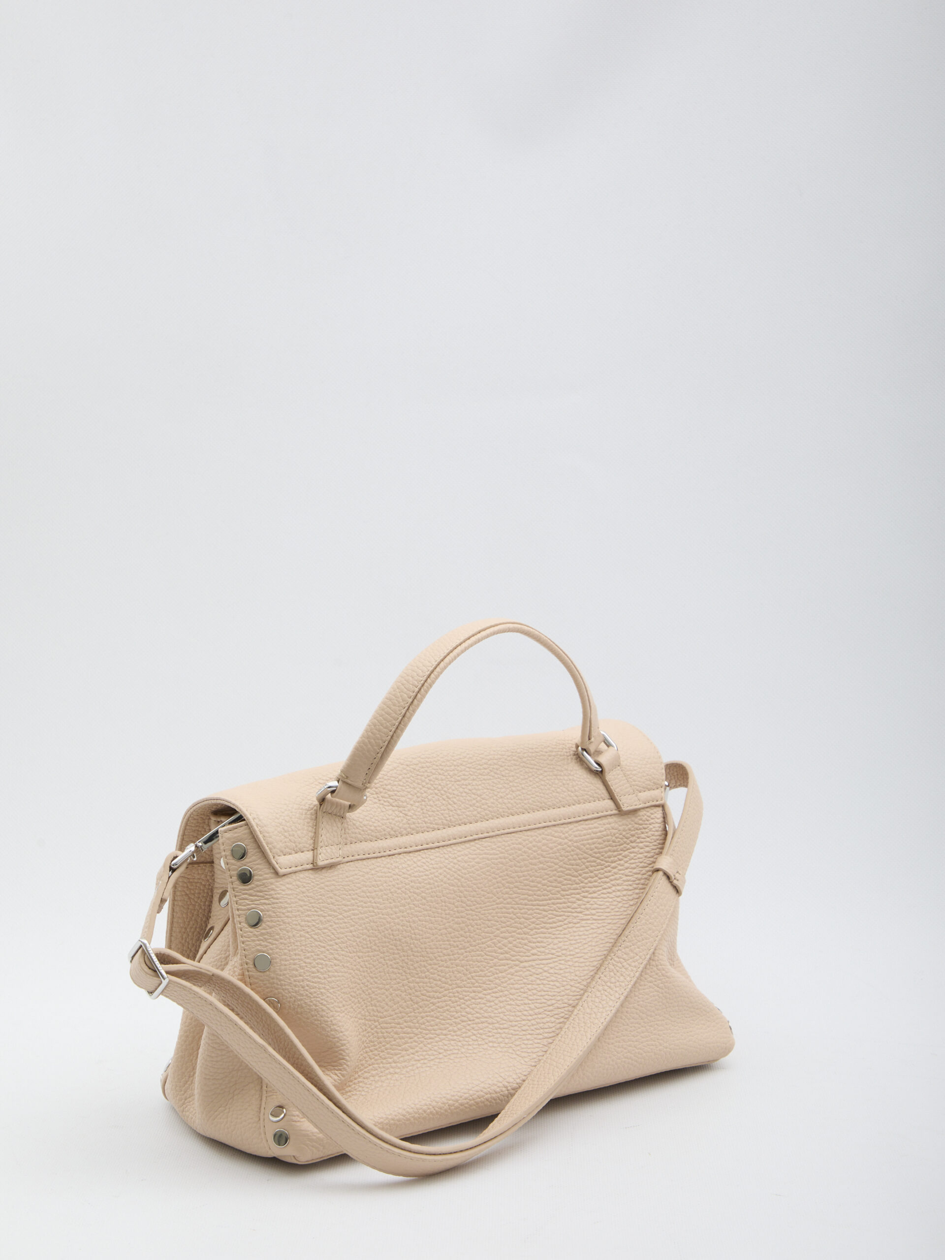 Light pink hammered leather bag. It features a fixed top handle, an adjustable and removable shoulder strap, a double swivel clasp closure, metal feet, two internal gusseted compartments, two flat pockets and one internal zippered pocket, cotton lining. Dust bag included. Any leather imperfections should not be considered manufacturing defects, but a characteristic of the material.