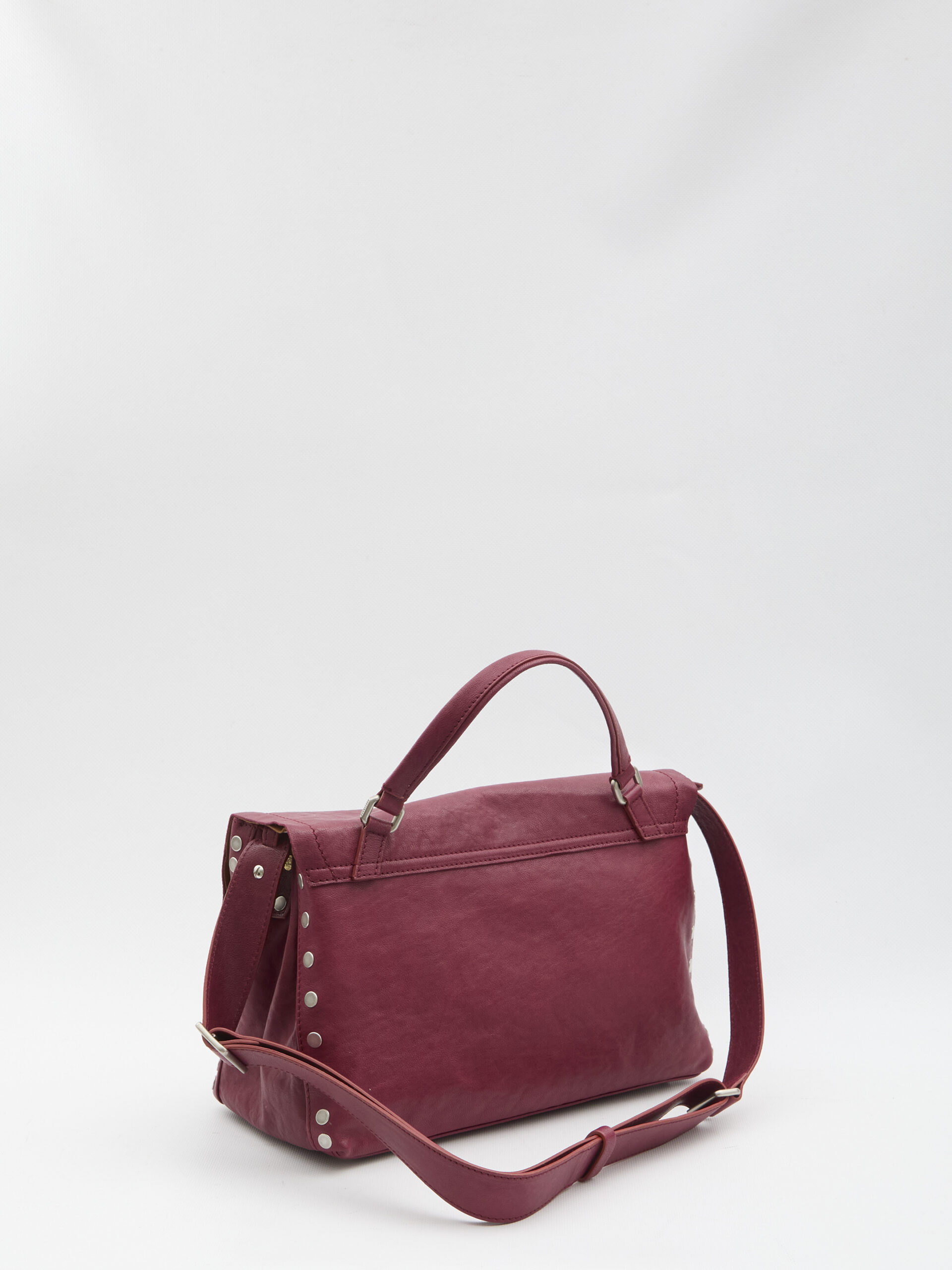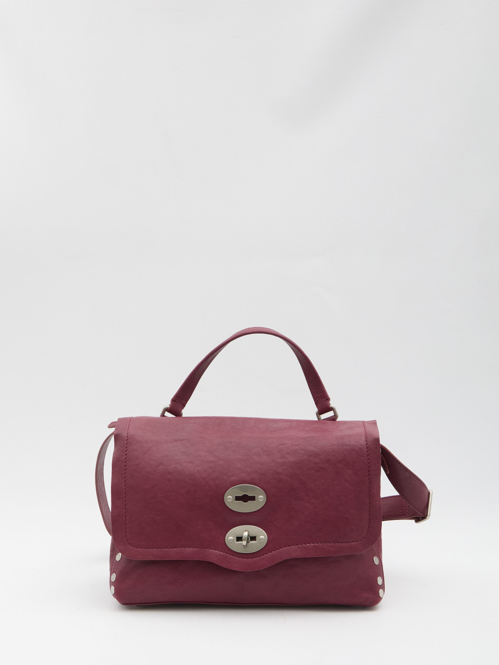 Postina Tabacco bag in Oriente red hammered lambskin leather. Features a fixed top handle, adjustable and removable shoulder strap, turn-lock closure, two main internal compartments, one internal zip pocket, one internal flat pocket, and anqitue silver-tone metal. Fabric lining. Dust bag included. Any natural leather imperfections are not considered manufacturing defects but a characteristic of the material.