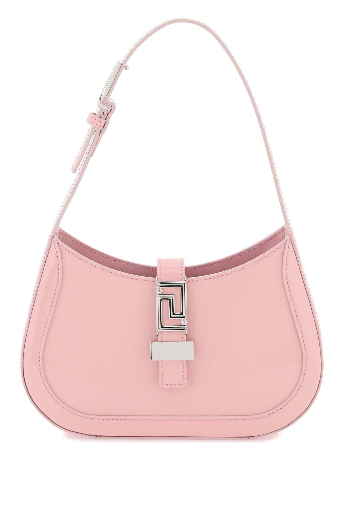 Versace hobo bag made of patent leather with magnetic closure embellished with gold metal Greca detail. Interior with one open pocket and adjustable handle with Greca pin buckle.
