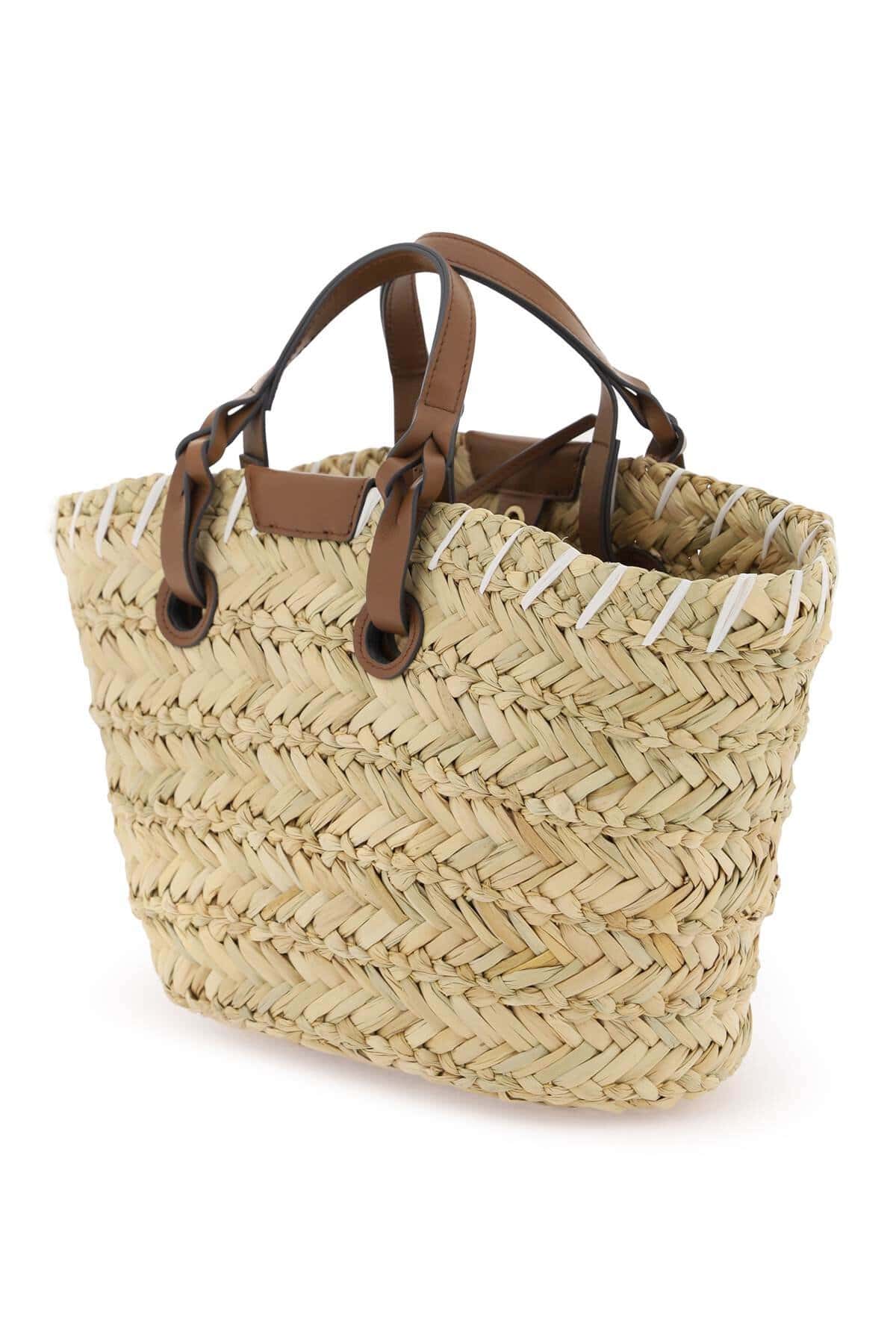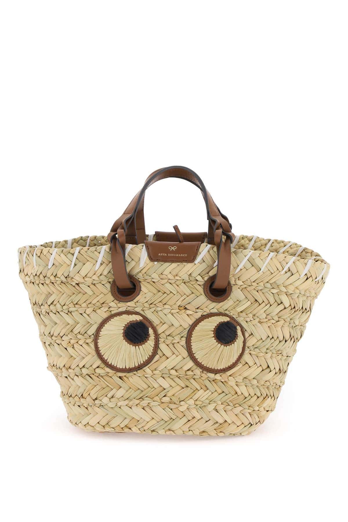 Anya Hindmarch handbag made of woven natural seagrass with iconic applied Eyes patches and leather handles. Drawstring closure and unlined interior with a leather slit pocket.