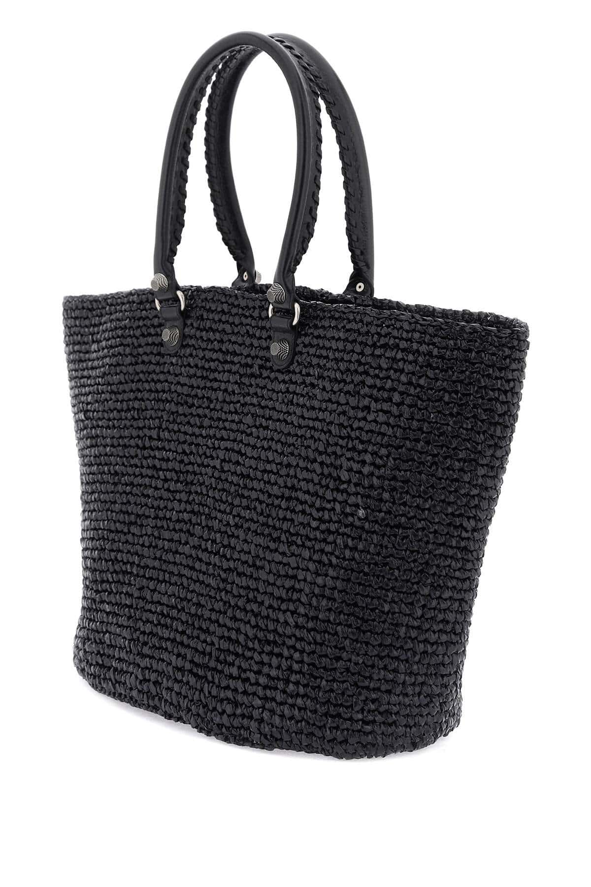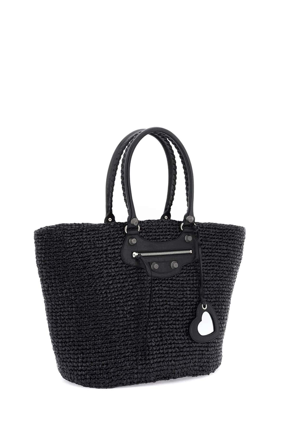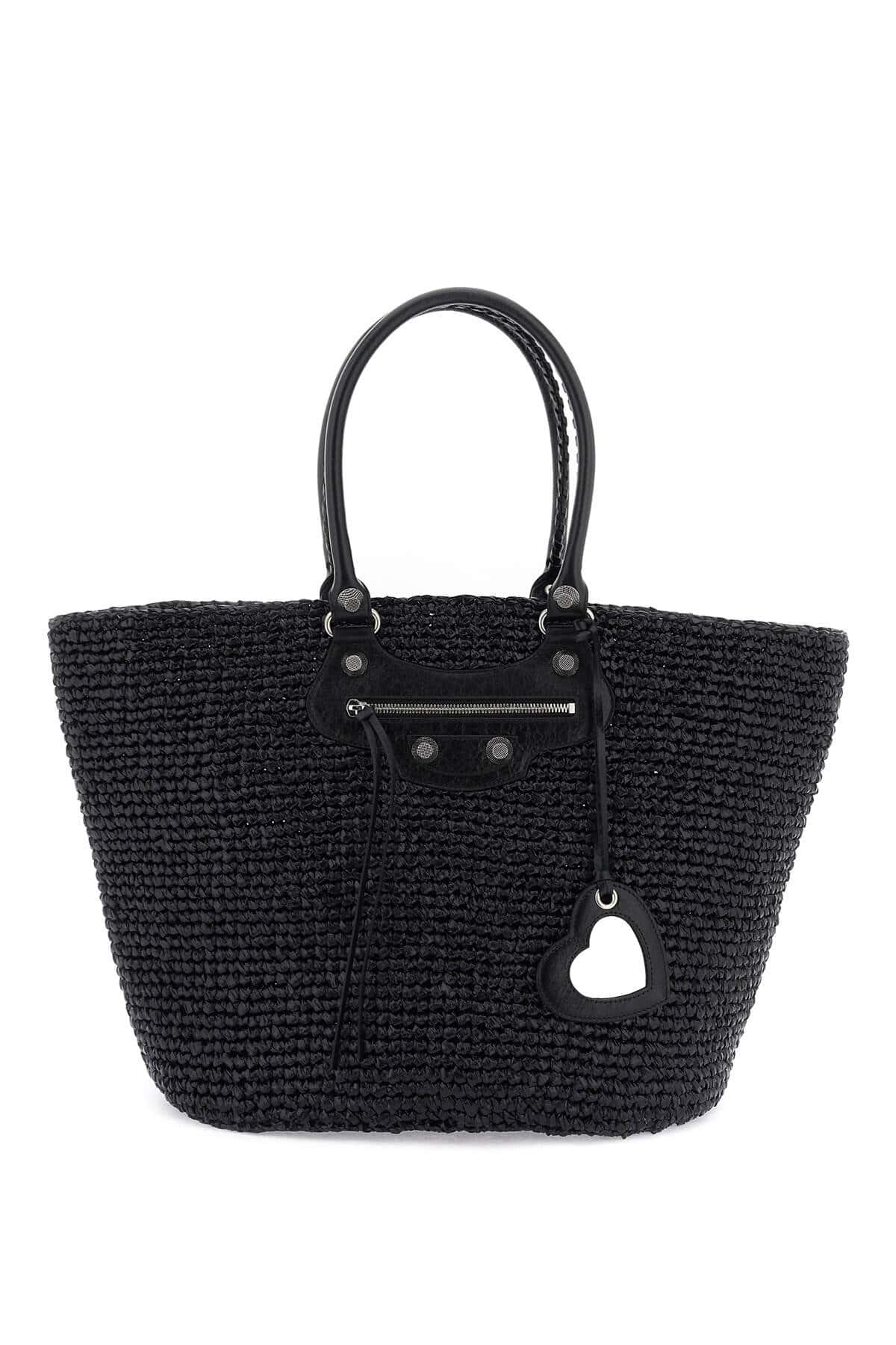 The Le Cagole basket bag by Balenciaga is made of transparent pink nylon with a raffia effect, featuring tonal Arena leather handles and details. The unlined interior includes a leather open pocket and a removable heart-shaped mirror. Antique silver-tone metal accessories complete the design.