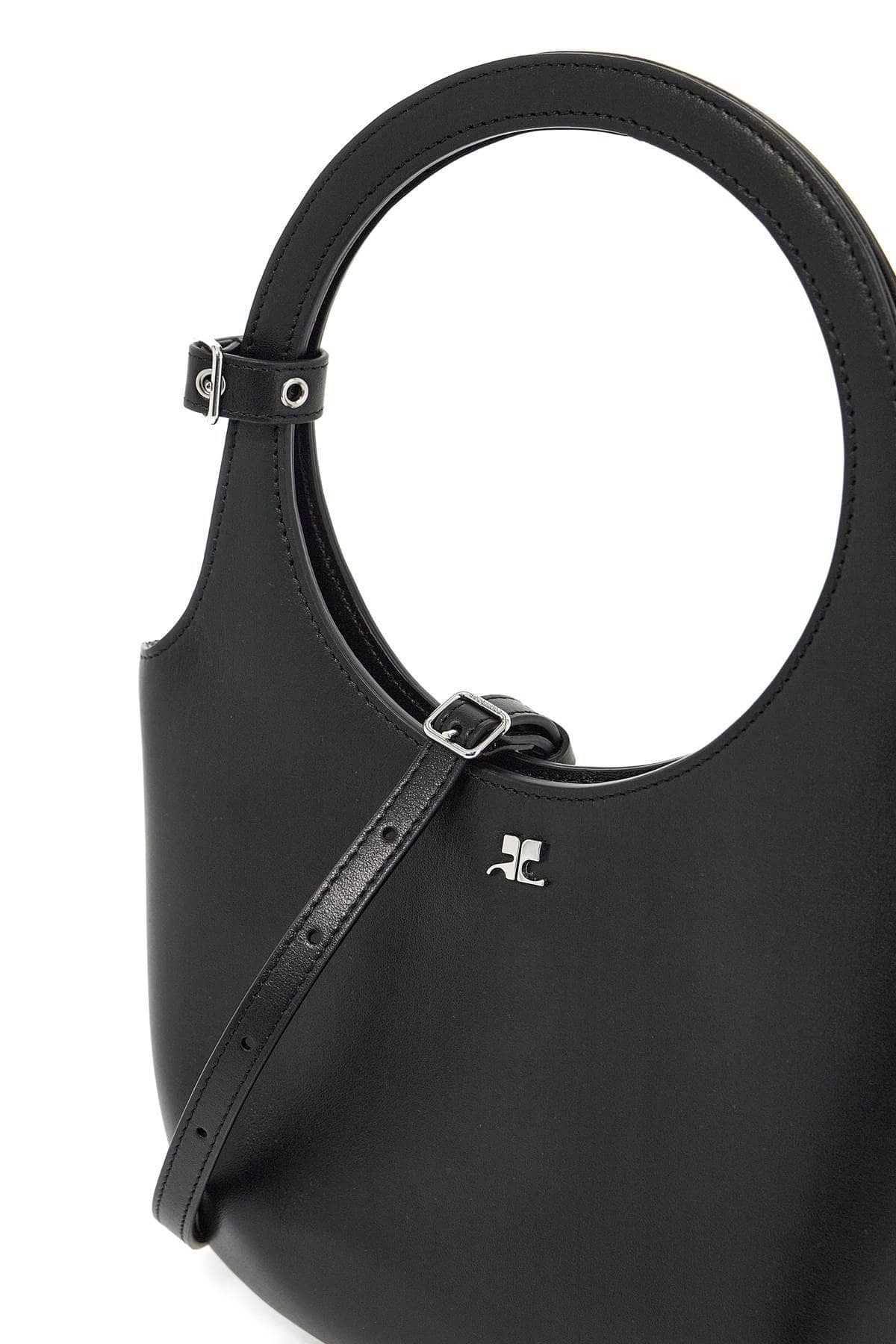 The Holy handbag by Courrges is made of smooth leather with a silver metal monogram. It features a magnetic closure, a removable decorative micro buckle on the handles, and a suede-like microfiber interior with an open pocket. The adjustable and removable shoulder strap adds versatility to this stylish bag.