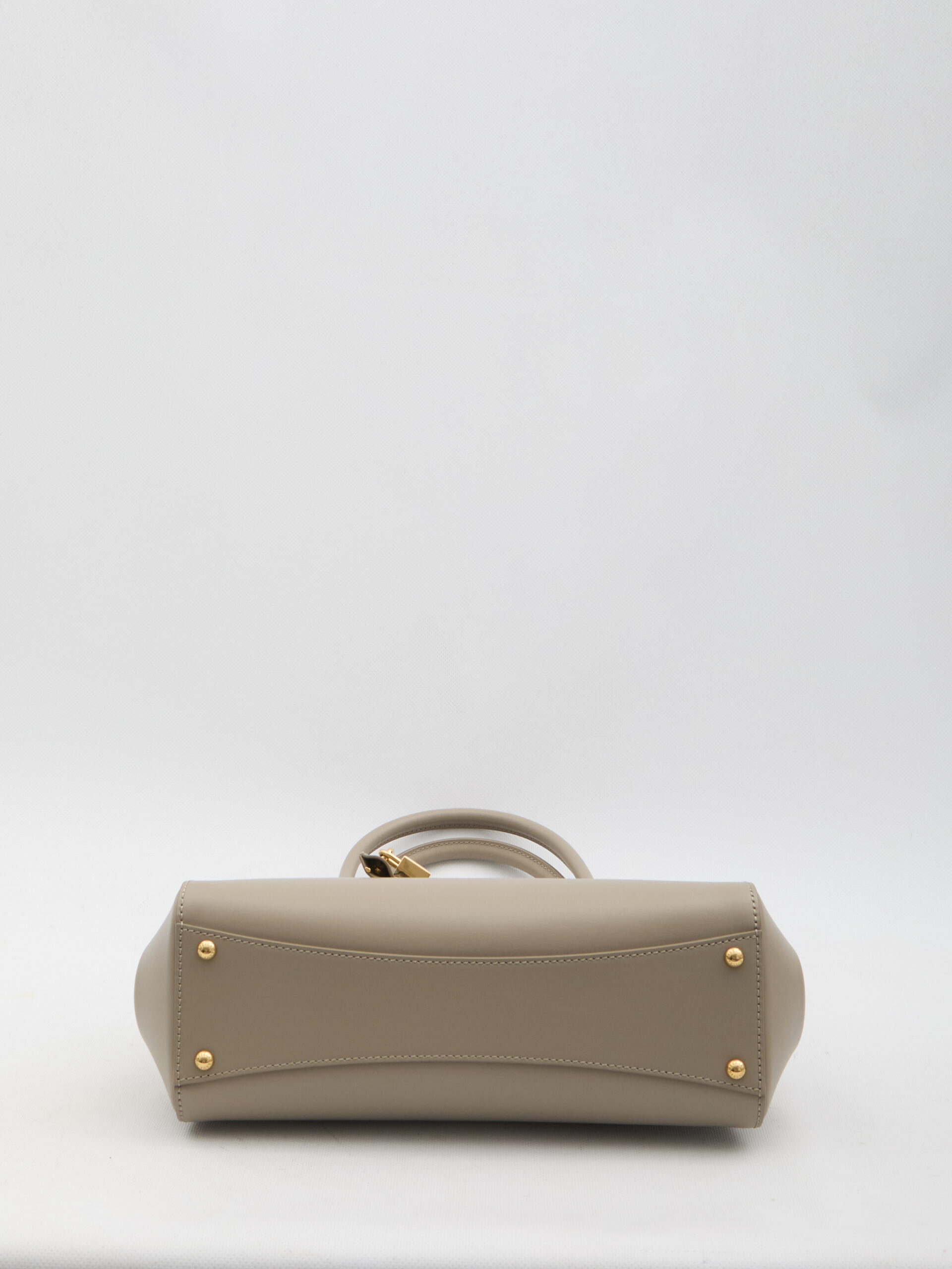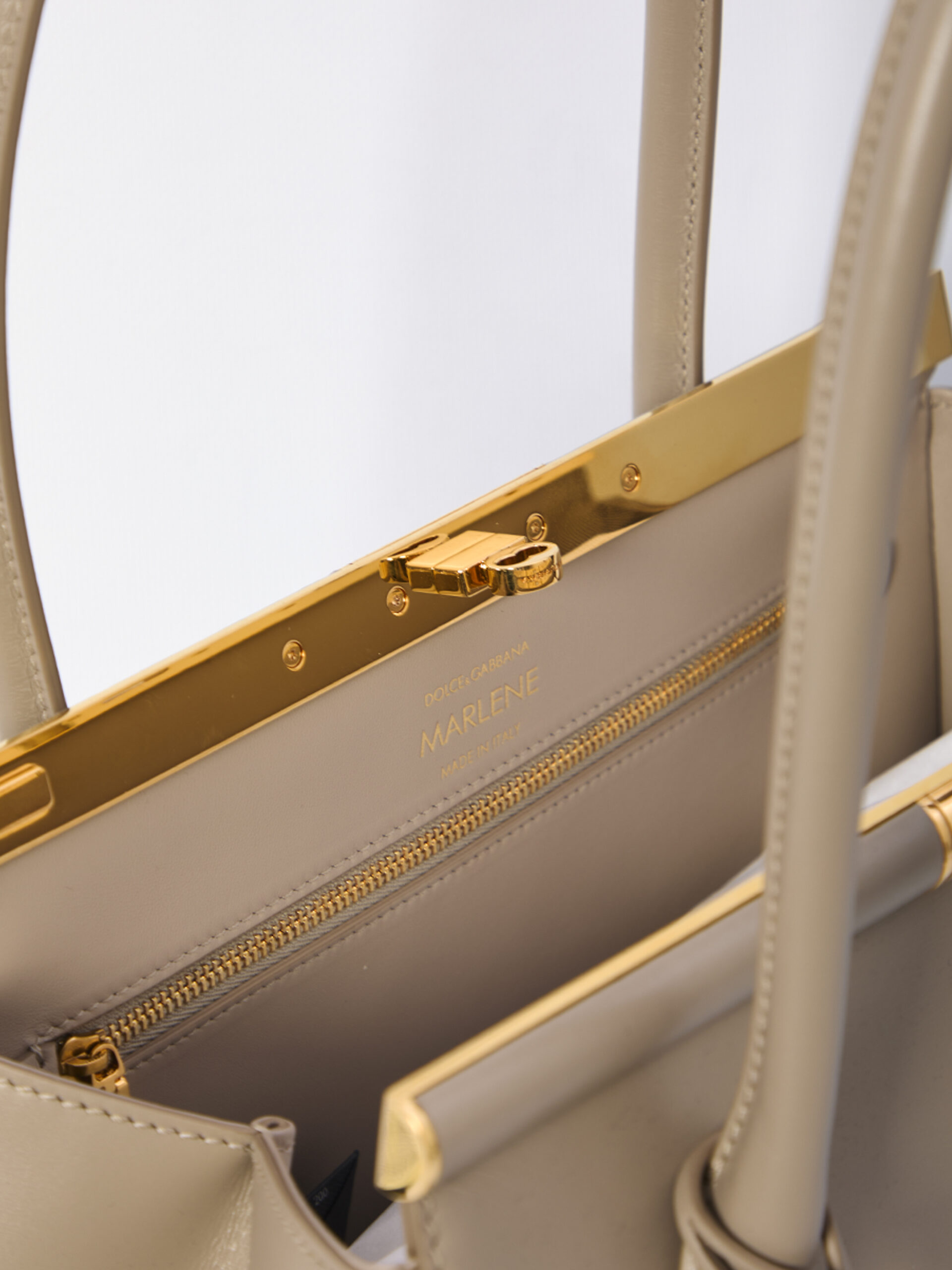 Marlene handbag in beige grained calfskin leather. It features two fixed top handles, a gold-finish galvanized metal turn-lock closure, a front gusset with a key and padlock, one main internal compartment, one internal zipped pocket, one flat internal pocket, and four metal feet at the base. Dust bag included. Any imperfections in the leather are not to be considered manufacturing defects but a characteristic of the material.