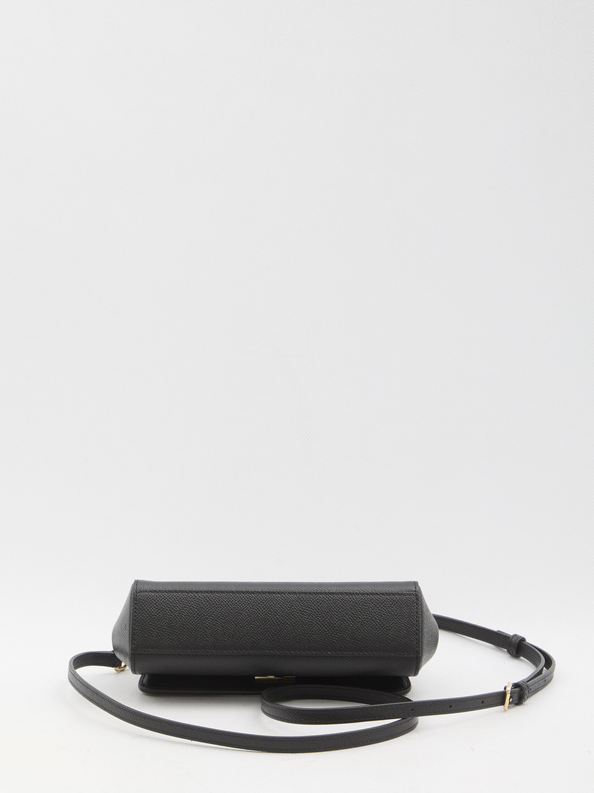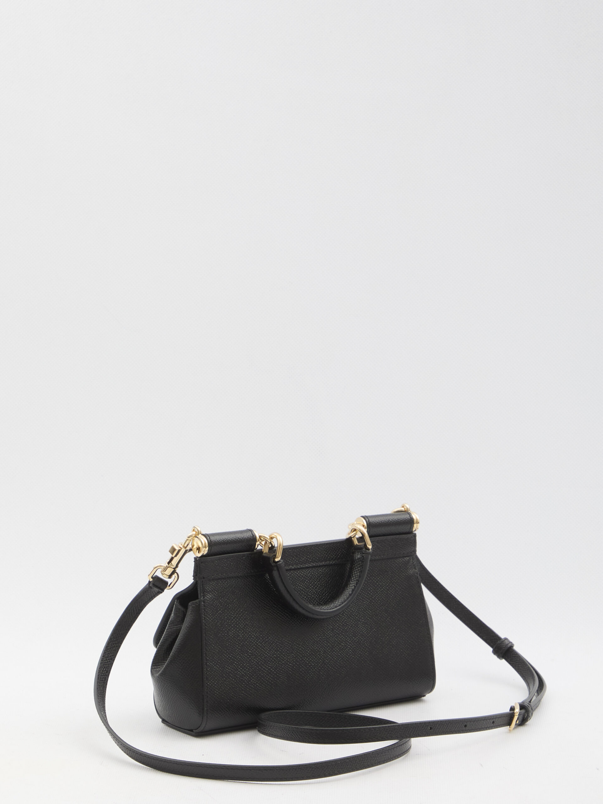Medium Sicily bag in black grained Dauphine calfskin with Dolce & Gabbana logo metal plate on the front. It features fixed top handle, adjustable and detachable shoulder strap, flap with tuck-in closure, one main interior compartment and one interior flat pocket. Inner lining in leopard print cotton. Any leather imperfections are not to be considered manufacturing defects, but a peculiarity of the material.