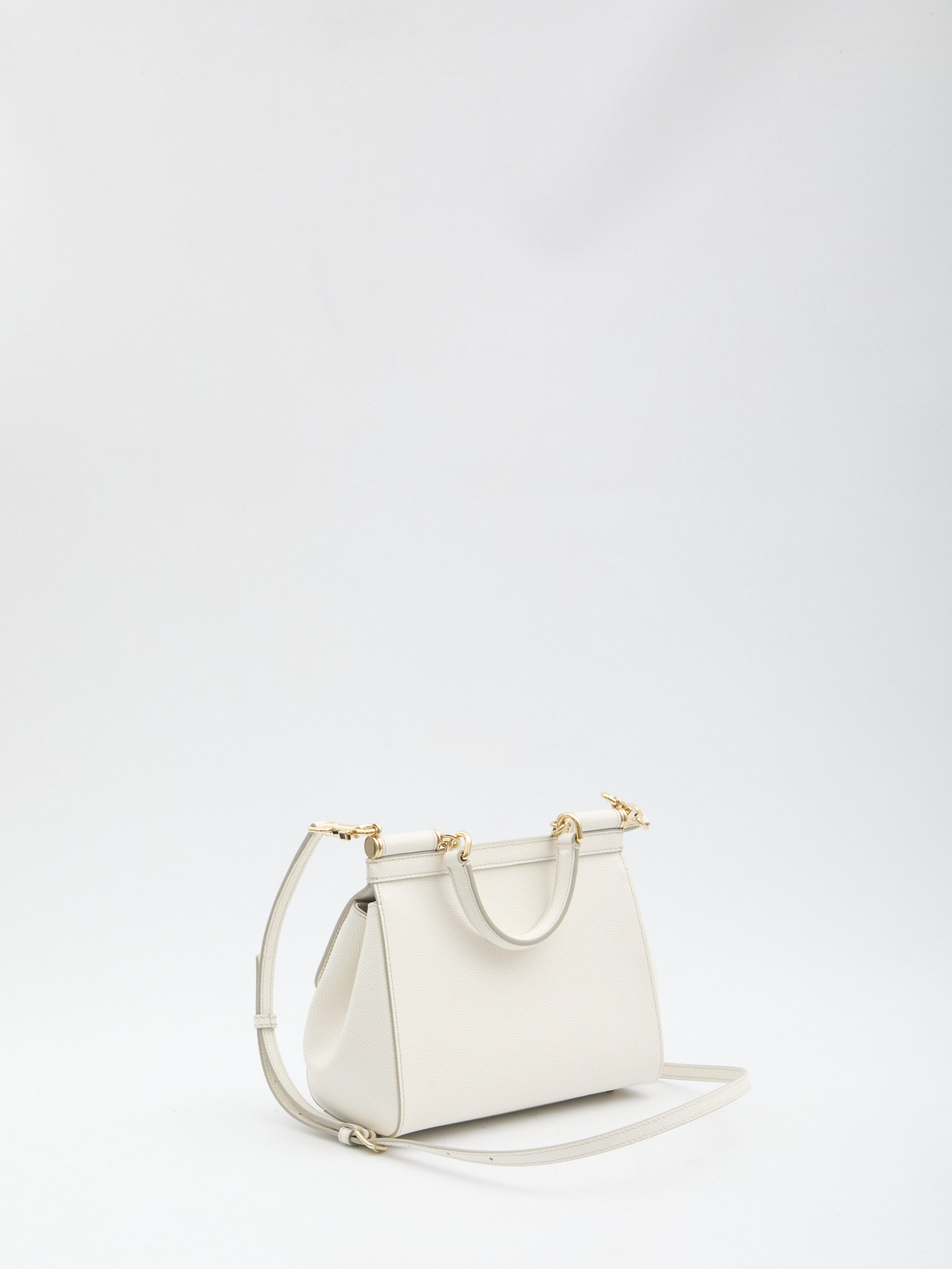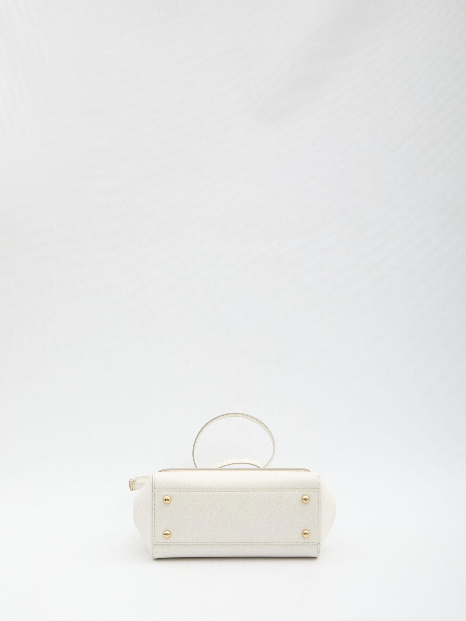 Handbag in white Dauphine calfskin. It features a front flap with a logo plaque, a top handle, an adjustable and removable shoulder strap, metal feet, a tuck-in closure, one main compartment, one flat pocket and one card slot inside, and animalier-print fabric lining. Dustbag included. Any natural imperfections in the leather are not manufacturing defects but a characteristic of the material.