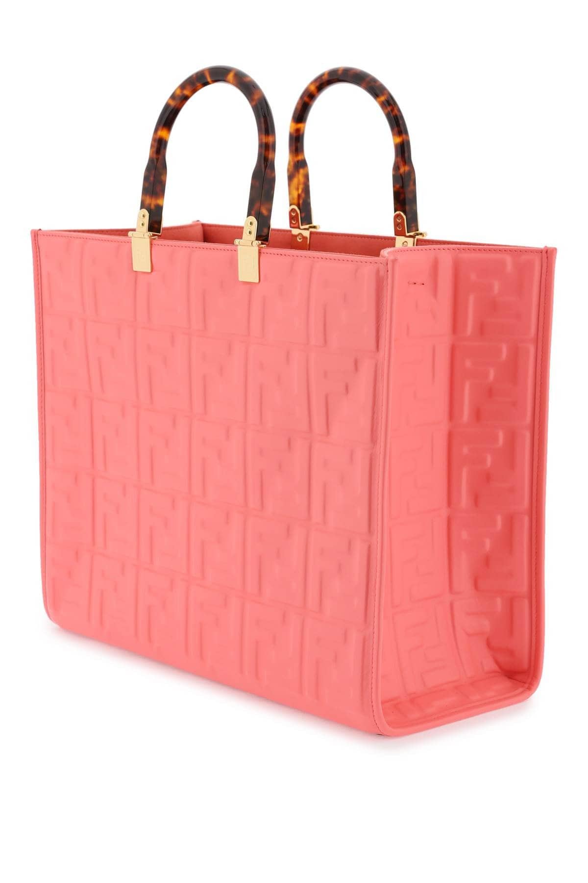 Fendi Sunshine medium leather tote bag with embossed FF motif with three-dimensional texture and tortoiseshell-effect plexiglass handles with gold-tone metal FF plaques. Detachable shoulder strap, suede interior, gold-tone metalware.