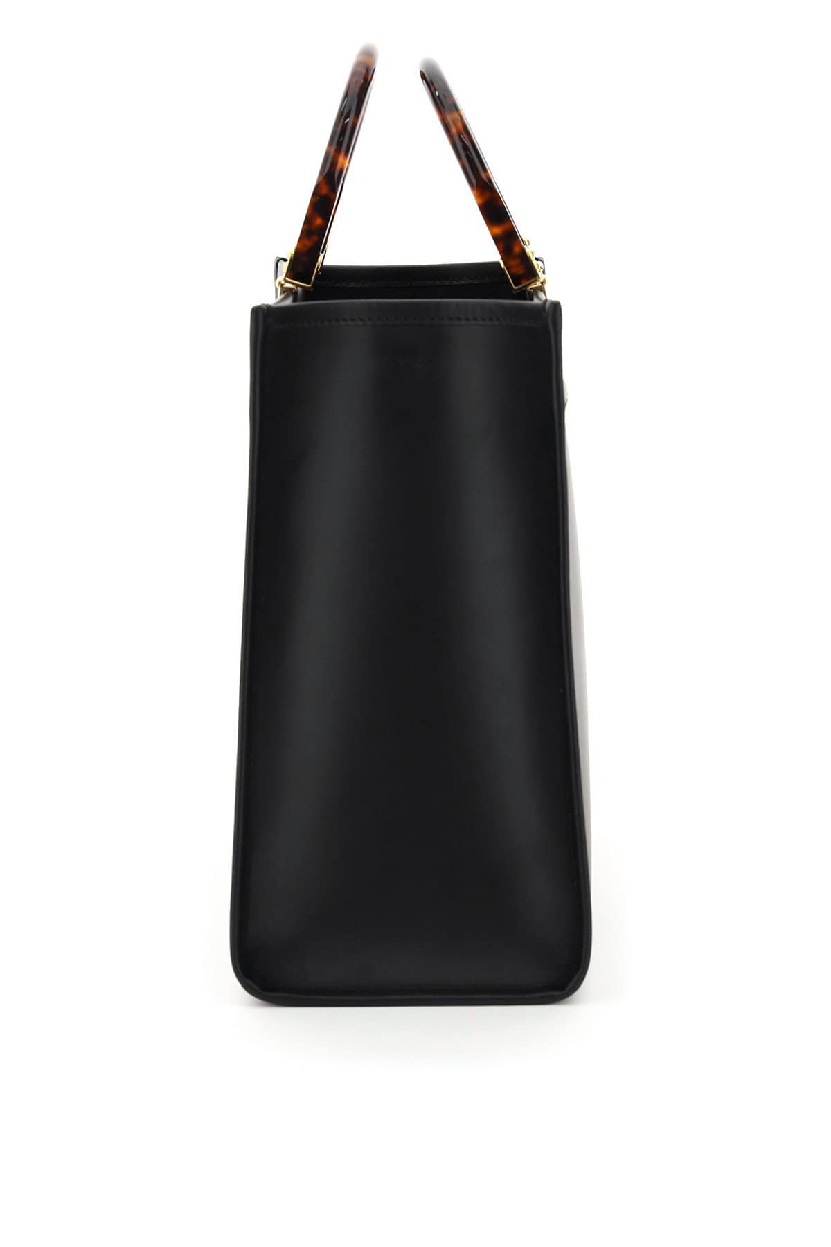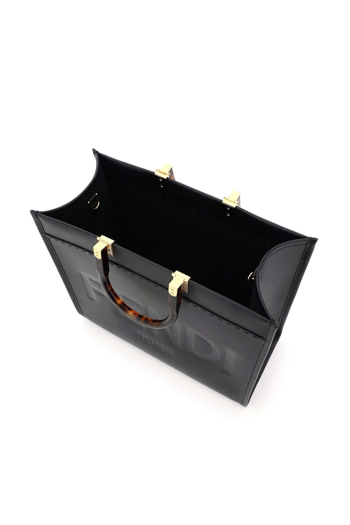Fendi Sunshine medium leather tote bag with maxi FENDI ROMA front print and tortoiseshell-effect plexi handles with gold-tone metal FF plaques. Removable shoulder straps, suede interior, gold-tone metalware.