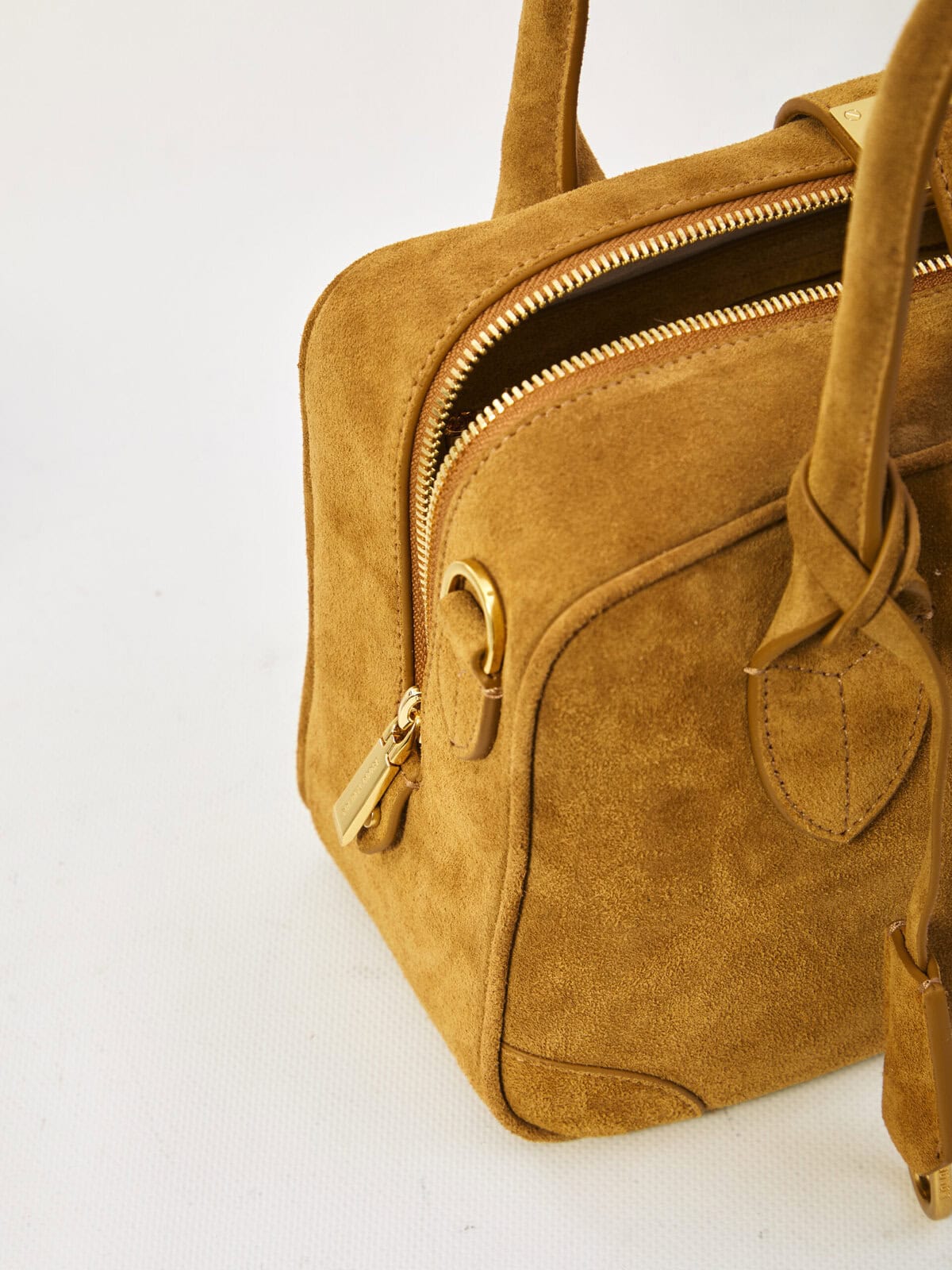 Camel suede leather Vita handbag. Featuring a double-slider zip closure with a gold turn-lock, two fixed top handles, a leather detail with a lobster clasp on the front, an engraved logo on the front, a removable and adjustable leather shoulder strap, one main internal compartment, an internal zip pocket, an internal card holder, two internal document pockets, and cotton lining. Dust bag included. Any imperfections in the leather should not be considered manufacturing defects, but rather a characteristic of the material.