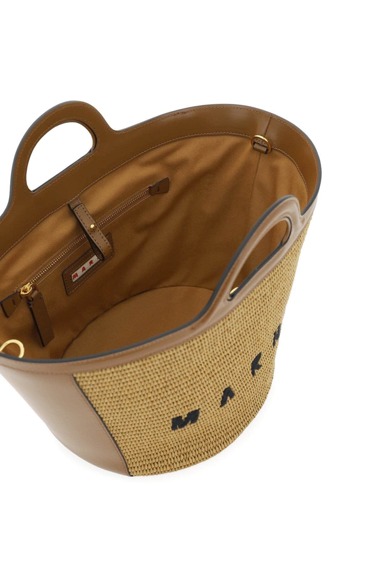 Small Tropicalia bucket bag by Marni crafted in raffia with contrasting embossed logo on front and smooth leather trimmings. Leather top handles and adjustable and detachable shoulder strap. Inner snap-hook closure, cotton lining and one inner zipped flat pocket. Gold-finished metalware.