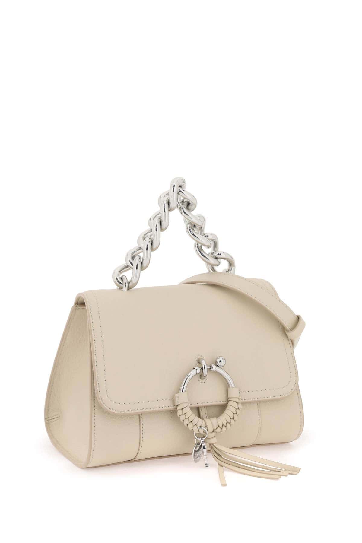 See By ChloƩ Joan handbag made of fine grained leather and embellished with the iconic woven leather ring and charms. Chain handle, magnetic closure, lined interior with an open pocket and additional slit pocket under the flap. Adjustable and detachable shoulder strap and silver-finished metalware.