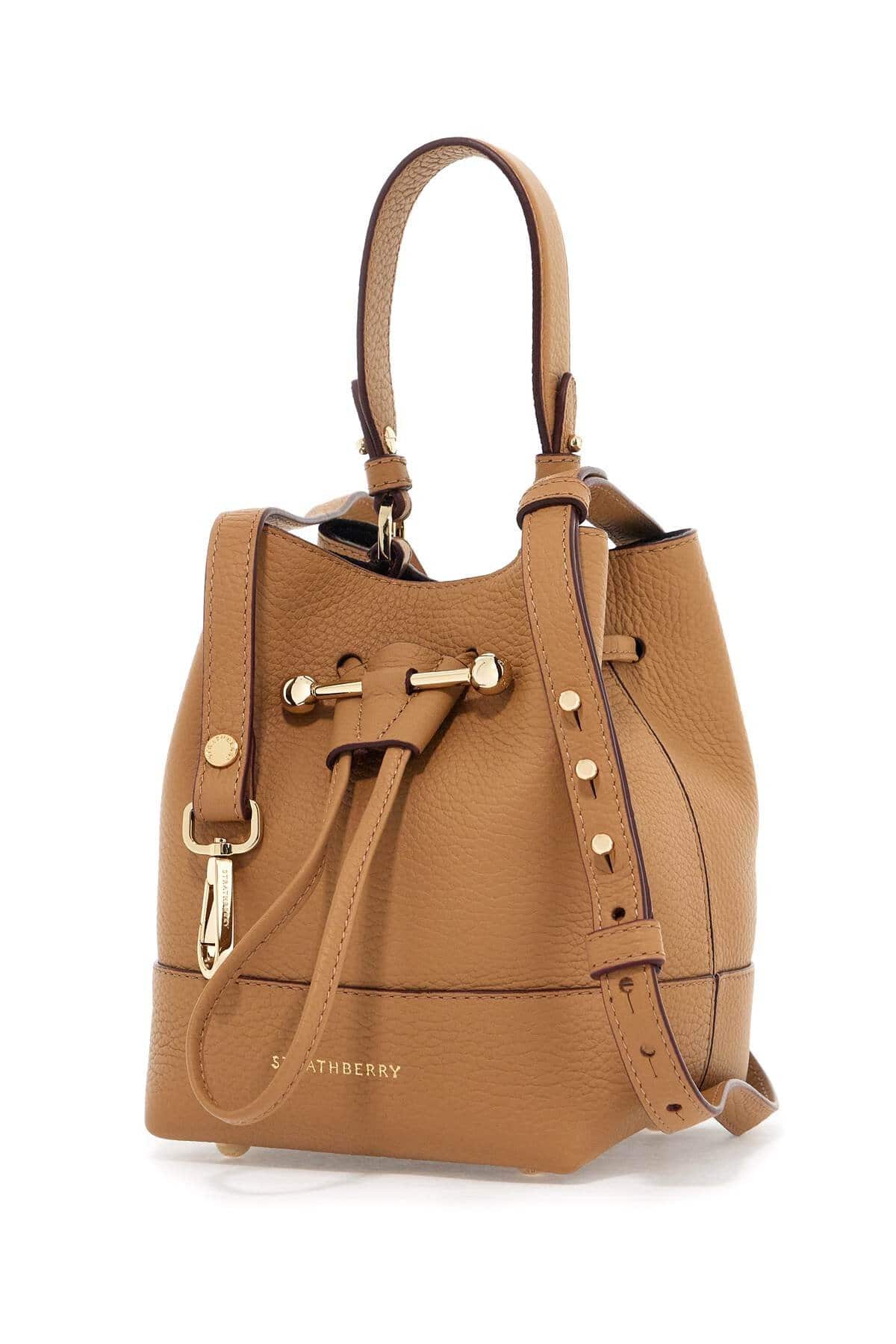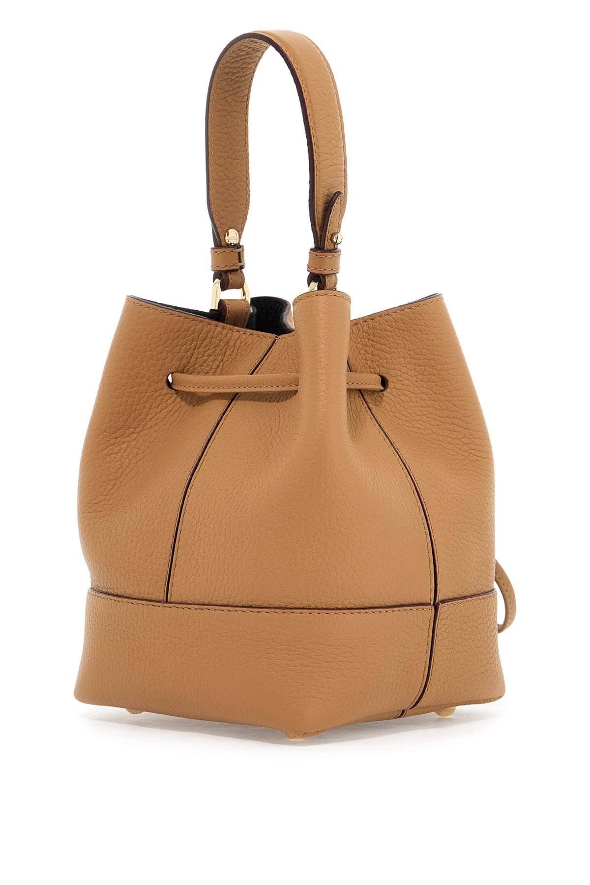 “Lana Osette” grained leather bucket bag with drawstring closure and iconic Bar applied. Detachable top handle, lined interior, protective studs and a adjustable and detachable shoulder strap for a crossbody look. Gold-finished metalware.