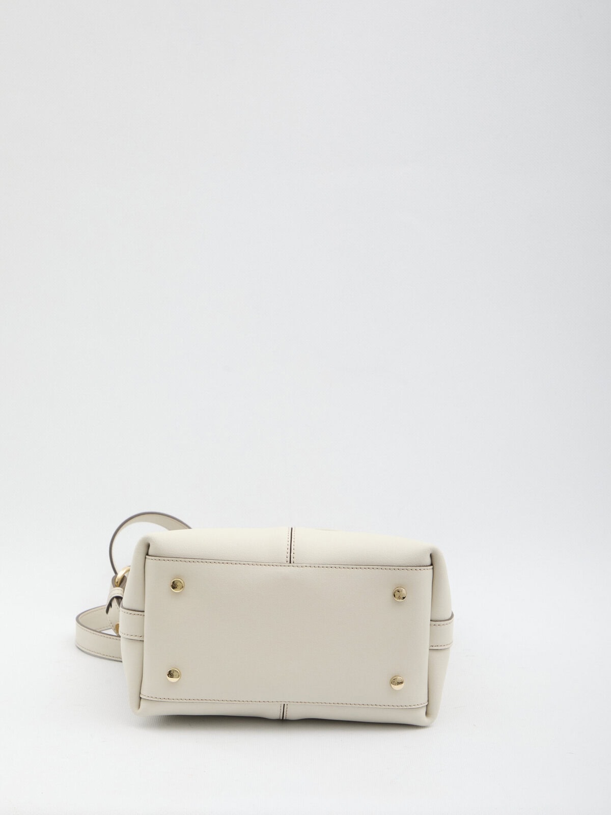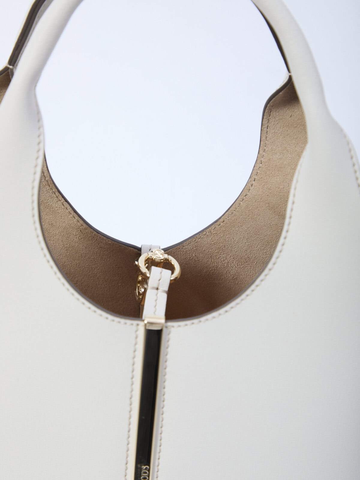 Mini shopping bag in white leather. It features two top handles, visible central stitching on the front and back with a gold-tone metal bar and engraved logo on the front, hook closure, a removable and adjustable shoulder strap, four metal feet on the bottom, one main compartment, and a suede interior. Dust bag included. Any imperfections in the leather should not be considered manufacturing defects but rather a characteristic of the material.