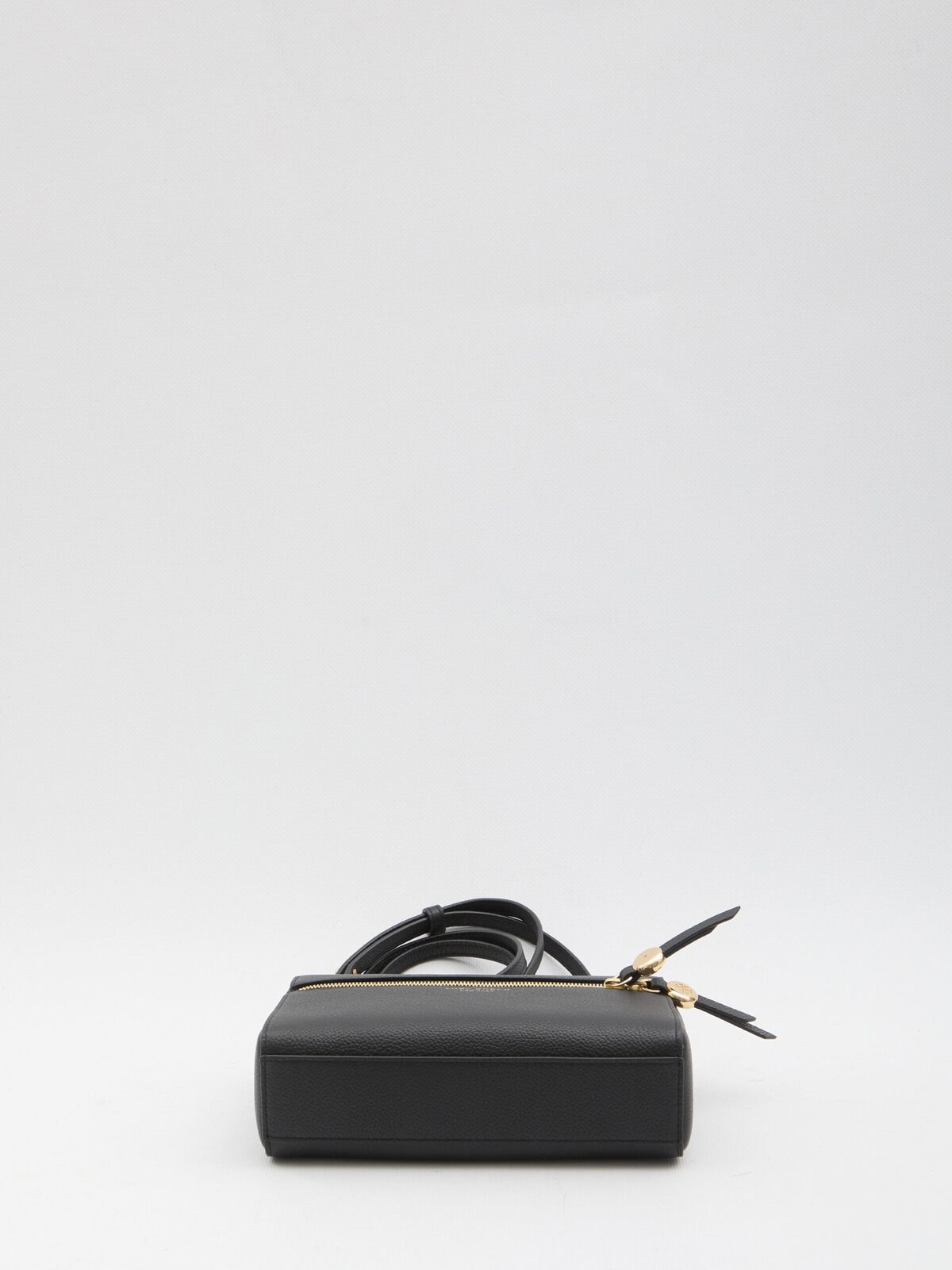 Black hammered leather bag. It features a thin top handle, an adjustable and removable shoulder strap, a double-slider zip closure with a branded metal detail, one main internal compartment with two card slots, and a microfiber lining. Dustbag included. Any imperfections in the leather should not be considered manufacturing defects, but rather a characteristic of the material.