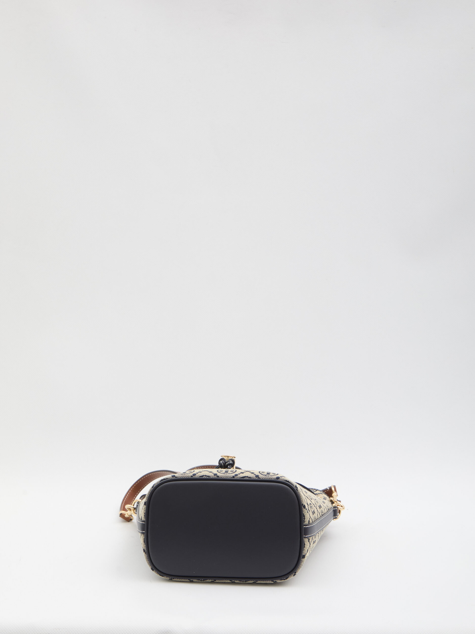 Bucket bag in cotton fabric and polyester jacquard in blue and beige “Tory Navy”. Featuring adjustable leather top handle, adjustable and removable shoulder strap, drawstring closure with metal detail, single interior compartment, small removable pouch, and leather accents. Dustbag included.