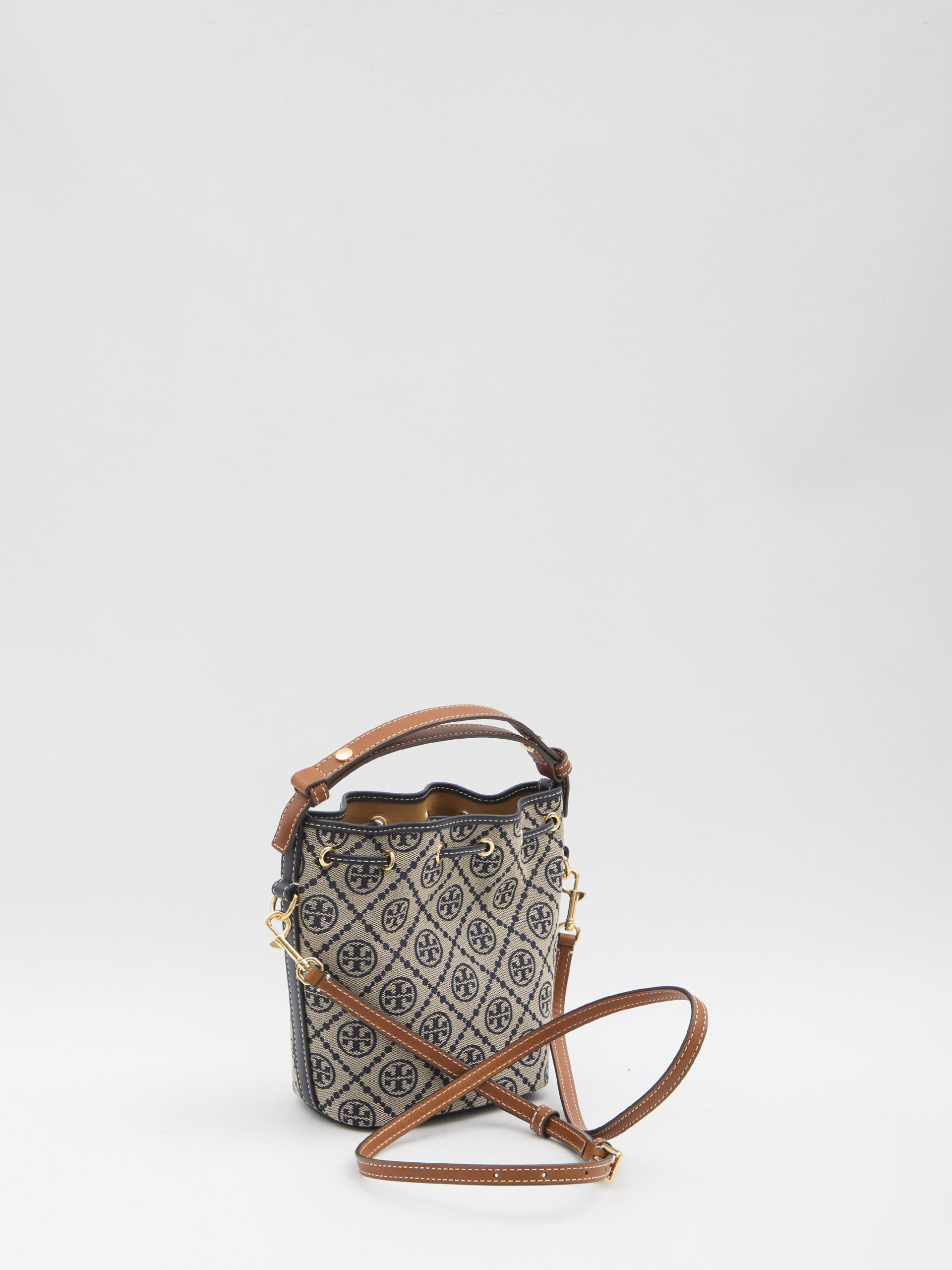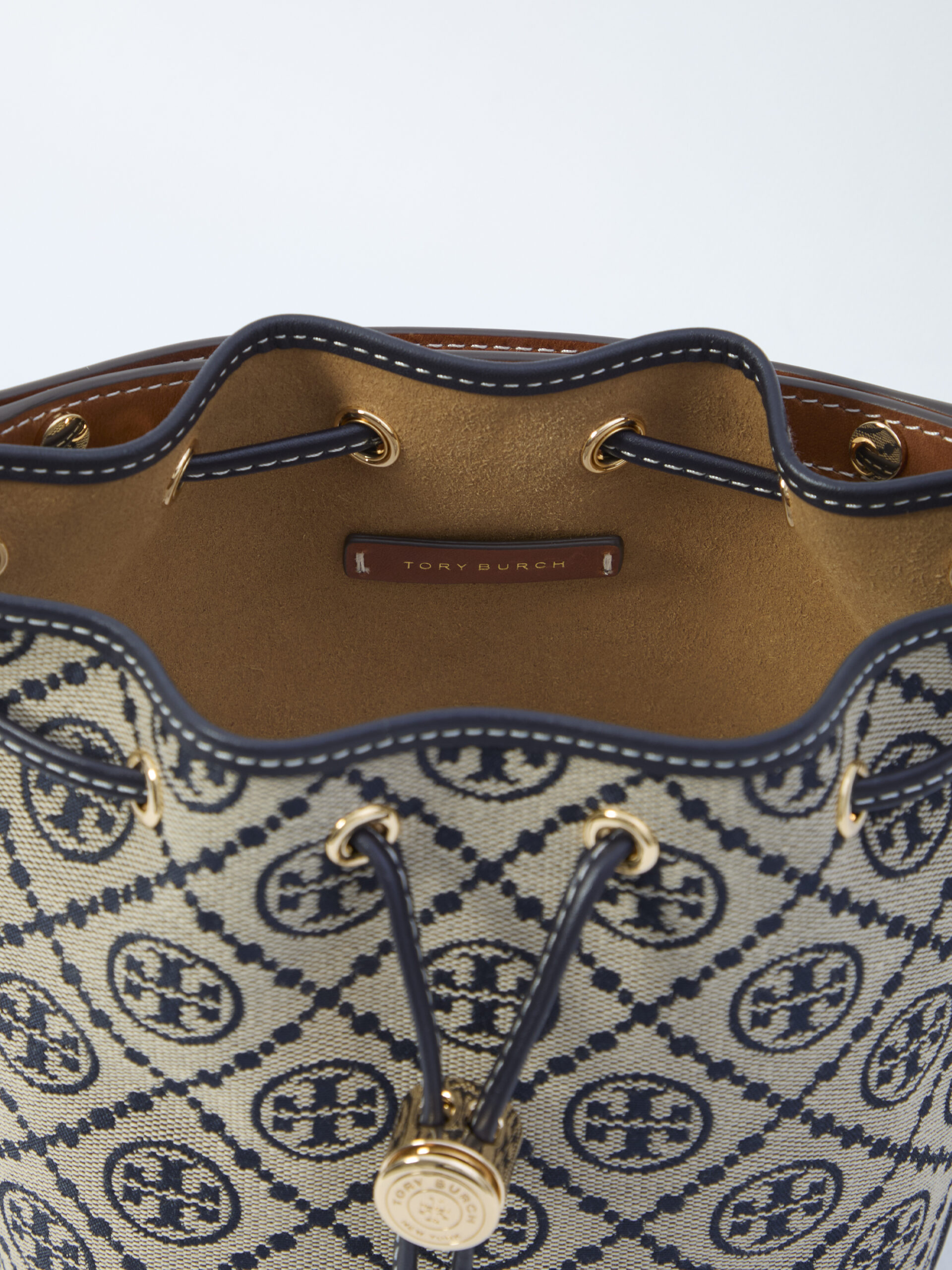 Bucket bag in cotton fabric and polyester jacquard in beige and blue “Tory Navy”. Featuring adjustable leather top handle, adjustable and removable shoulder strap, drawstring closure with metal detail, single interior compartment, and leather accents. Dustbag included.