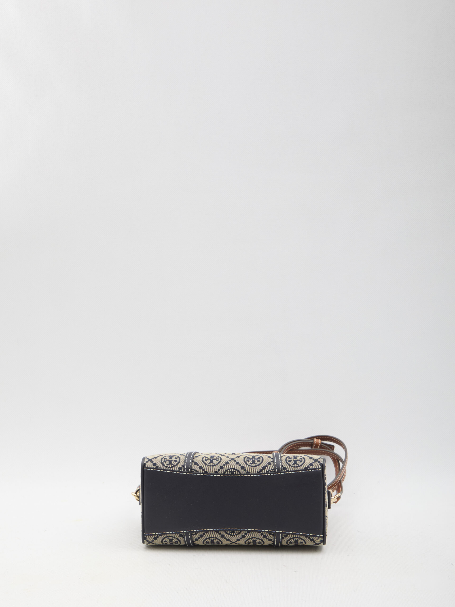 Mini bag in jacquard fabric with an all-over beige and navy blue T Monogram pattern. It features brown leather finishes, two fixed brown leather handles, a zip closure, removable and adjustable leather strap, a single interior compartment, and a flat internal pocket. Dust bag included. Any imperfections are not considered manufacturing defects but rather a characteristic of the material.