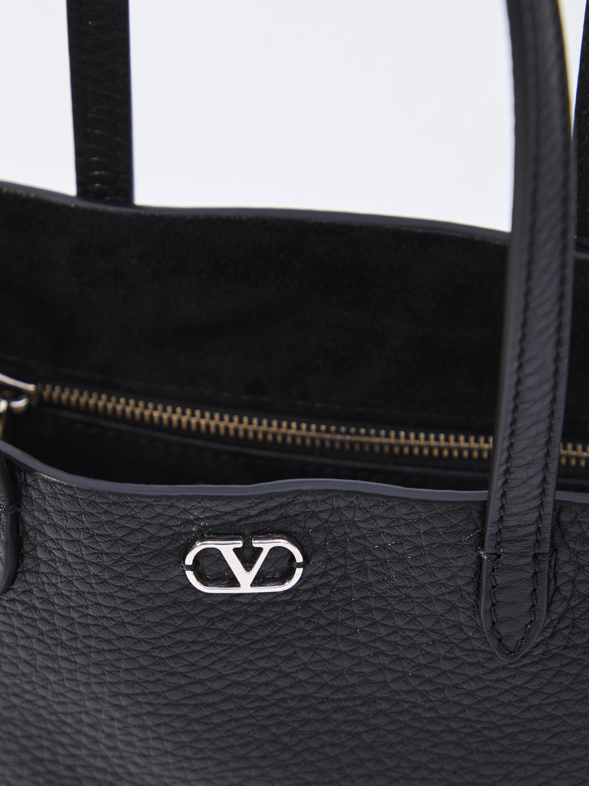 Black grained calf leather bag. Features two fixed top handles, spherical stud and rivet detailing along the sides, metal VLogo, and one main compartment with an internal zip pocket. Suede lining. Dust bag included. Any natural imperfections in the leather are not considered manufacturing defects but a unique characteristic of the material.