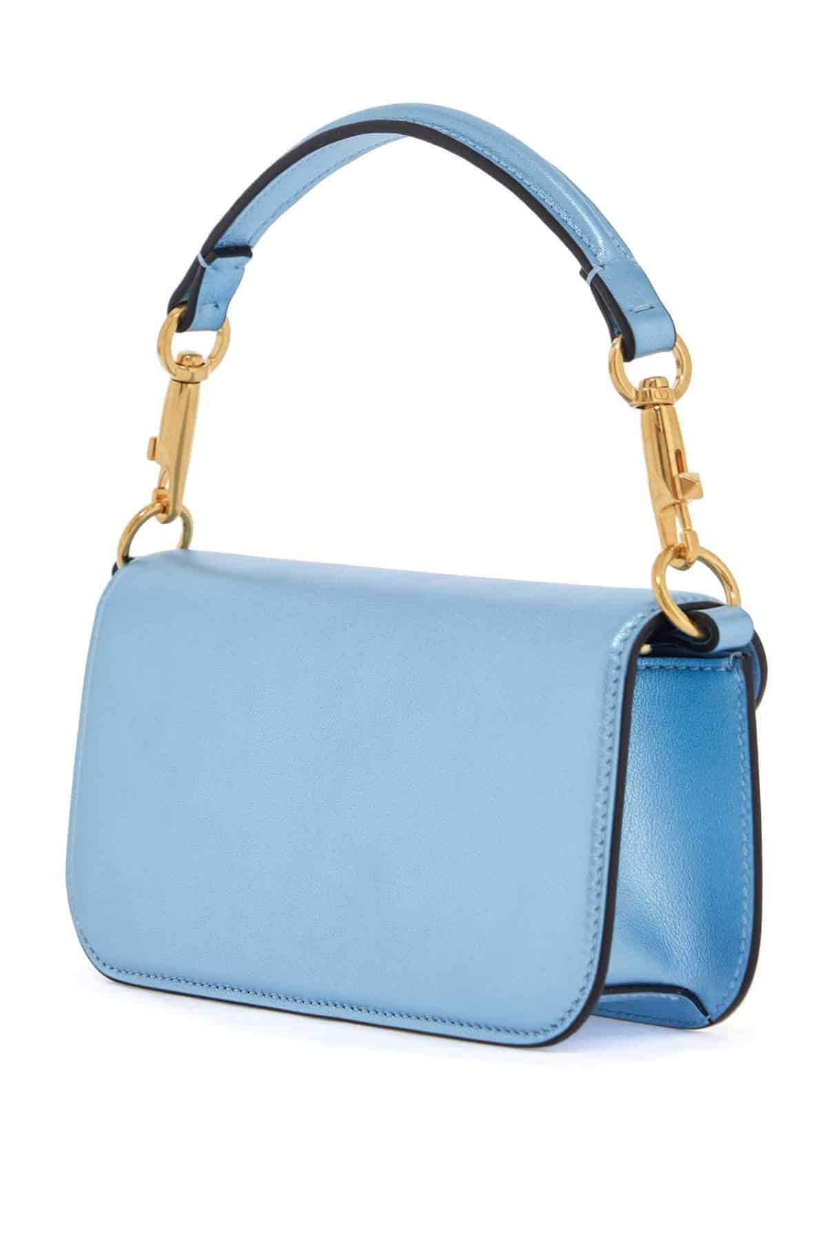 The Loc shoulder bag by Valentino Garavani is made of metallic leather with a VLogo Signature jewel element decorated with Swarovski crystals. It features a magnetic closure, a leather interior with an open pocket, a removable leather handle, and a removable chain shoulder strap. The metal accessories have a gold finish.