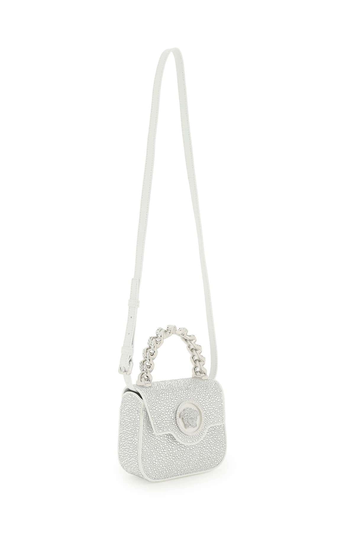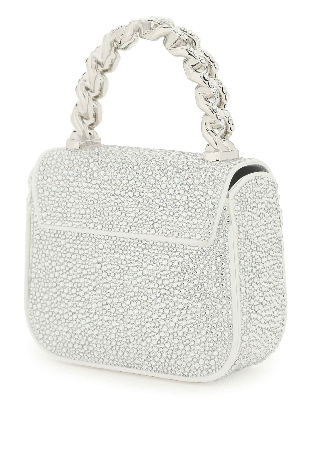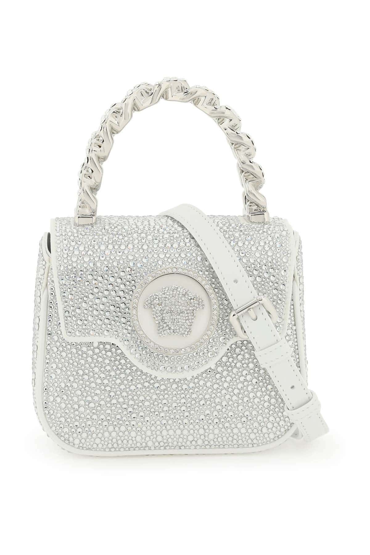 Versace handbag made of satin and studded with crystals with iconic medusa appliqu on the flap. Magnetic closure, leather interior with three credit card slots, rigid chain handle with crystals, and adjustable, detachable leather shoulder strap.