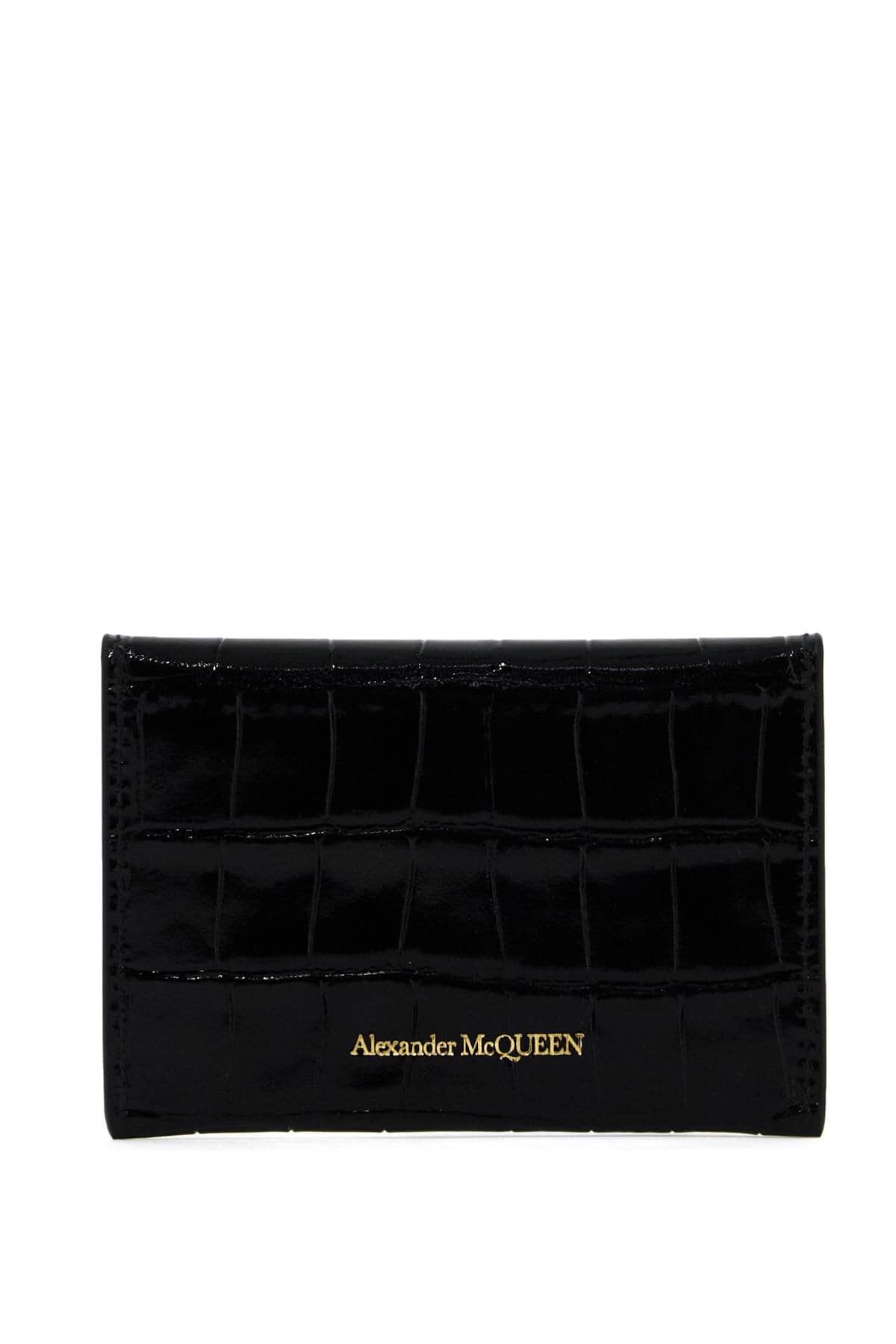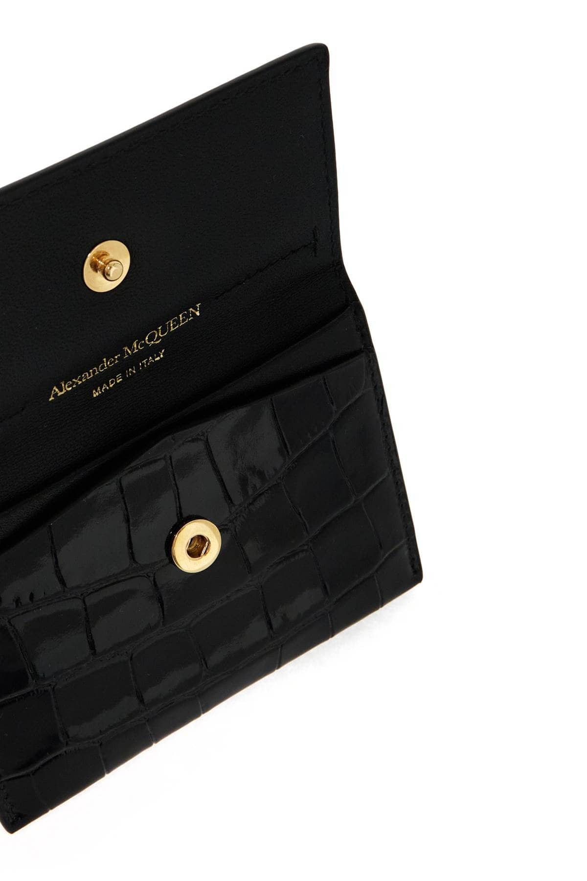 Alexander McQueen cardholder in crocodile-embossed leather, enriched by the iconic gold-tone metal Skull with crystals on the front flap. Snap button closure, gold-tone logo print on the back, leather-lined interior with two flat pockets.