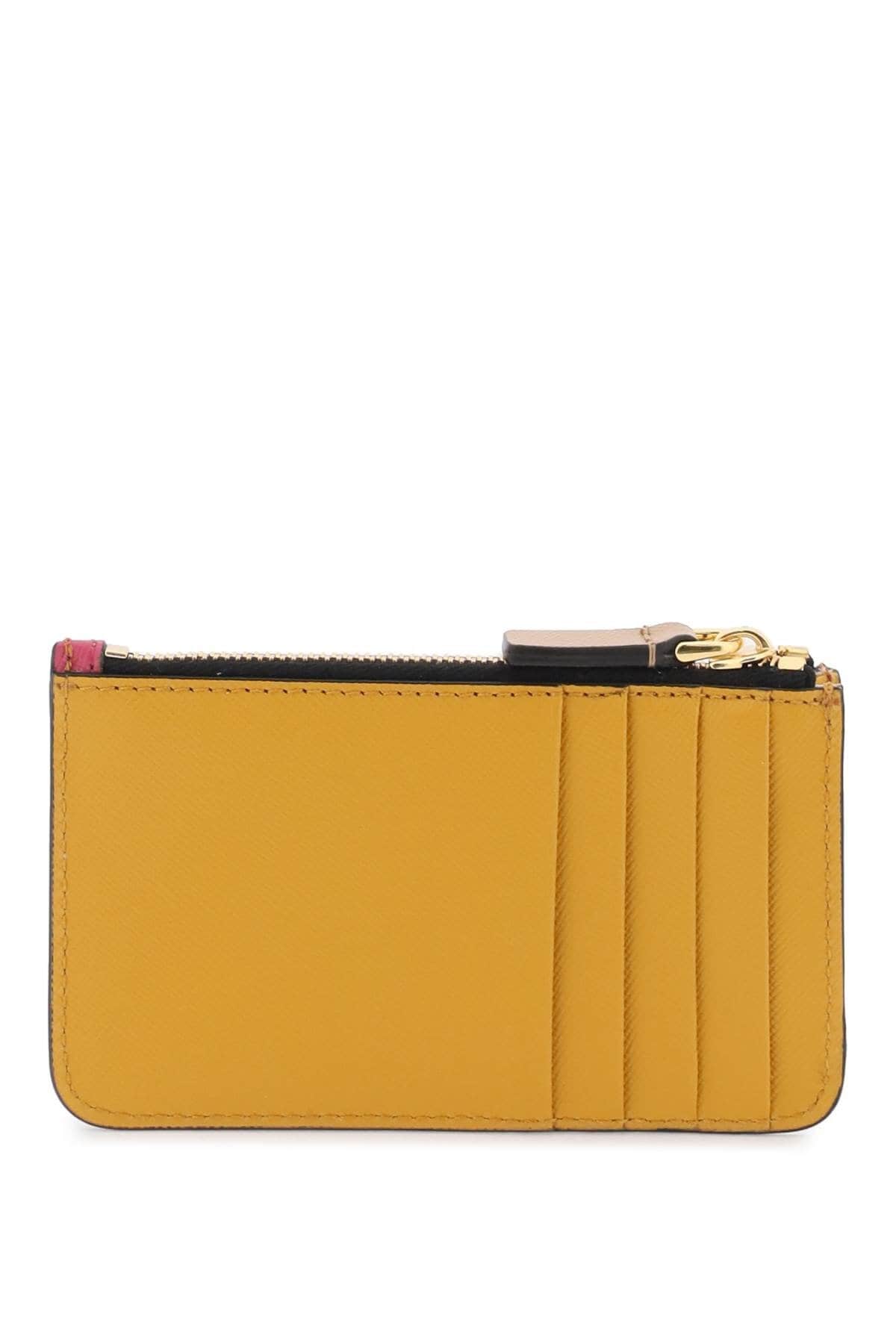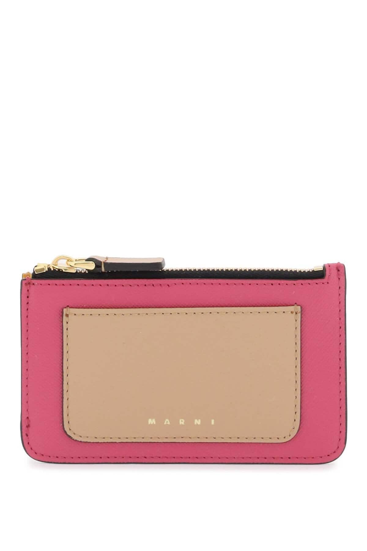 Marni tricolor cardholder crafted in saffiano leather, featuring a front small patch pocket, four credit card slots on the back and a middle zipped compartment with gusseted side and cotton lining. Gold-tone micro logo print on front and gold-finished metalware.