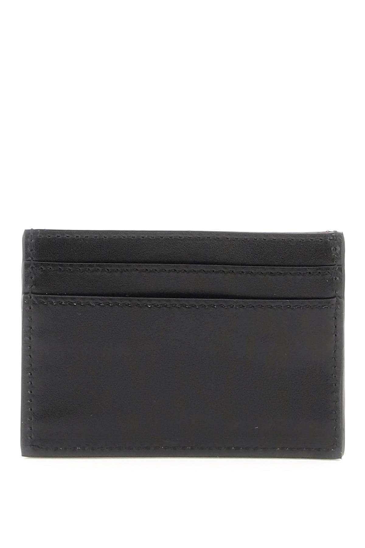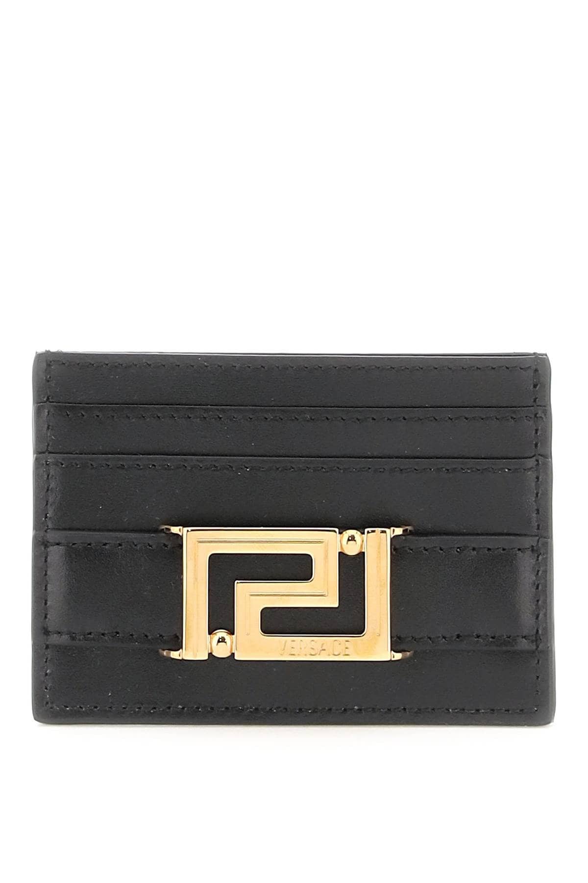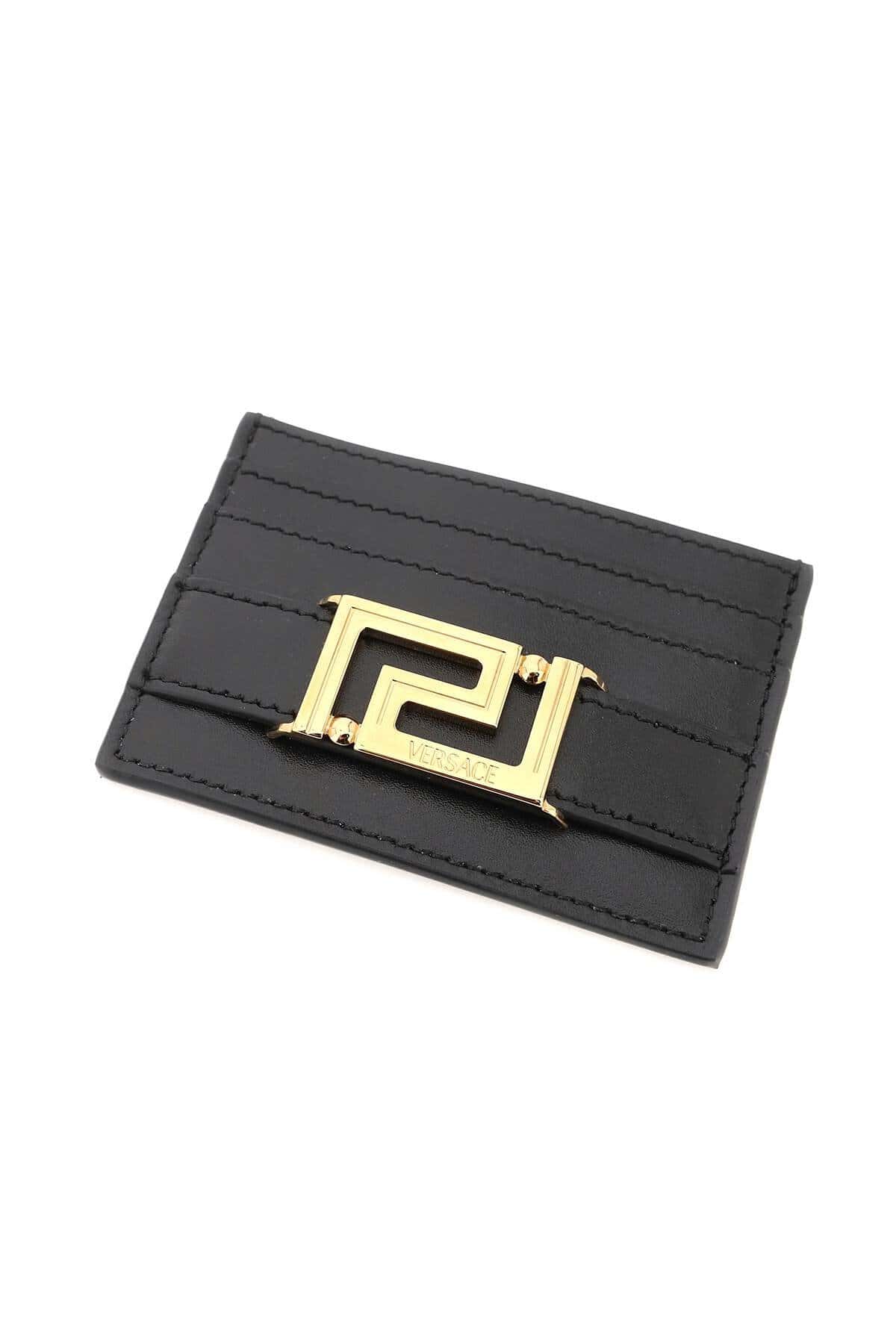 Versace credit card holder made of leather with iconic gold metal Greca Goddes, two slots on each side and a central slIt pocket.