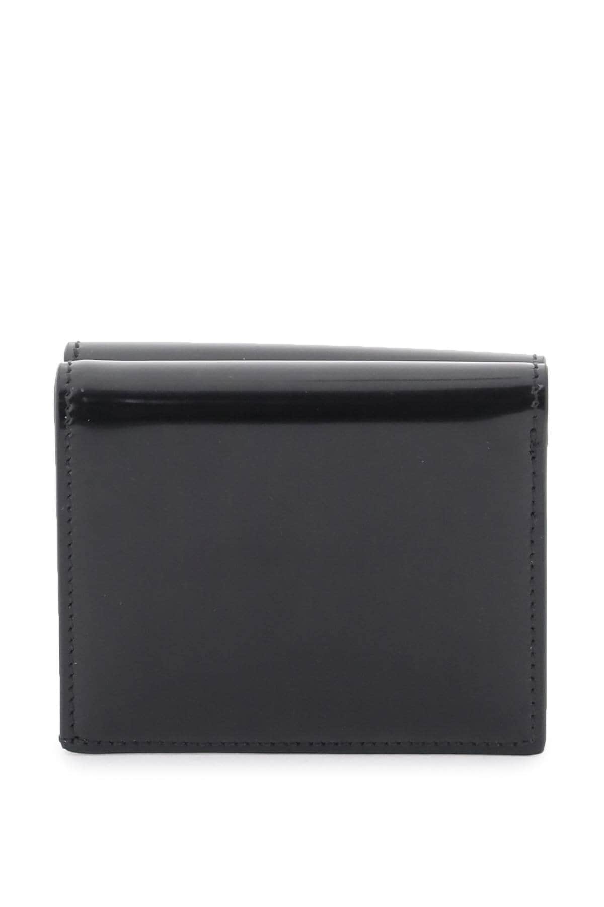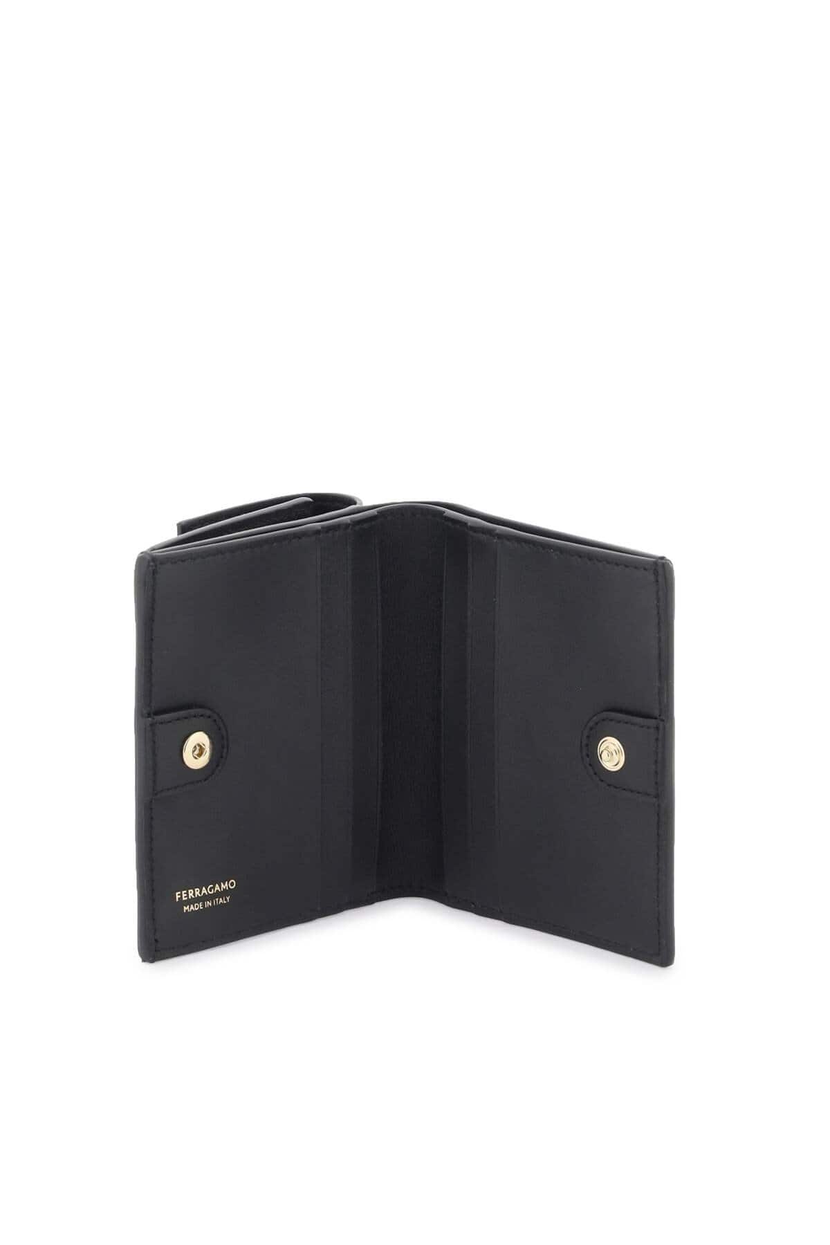 FERRAGAMO wallet made of brushed leather with exterior coin pocket closed by metal Gancini with gold finish. Smooth leather interior with snap-button closure with four card slots, two slit pockets and gold-tone printed lettering logo detail.