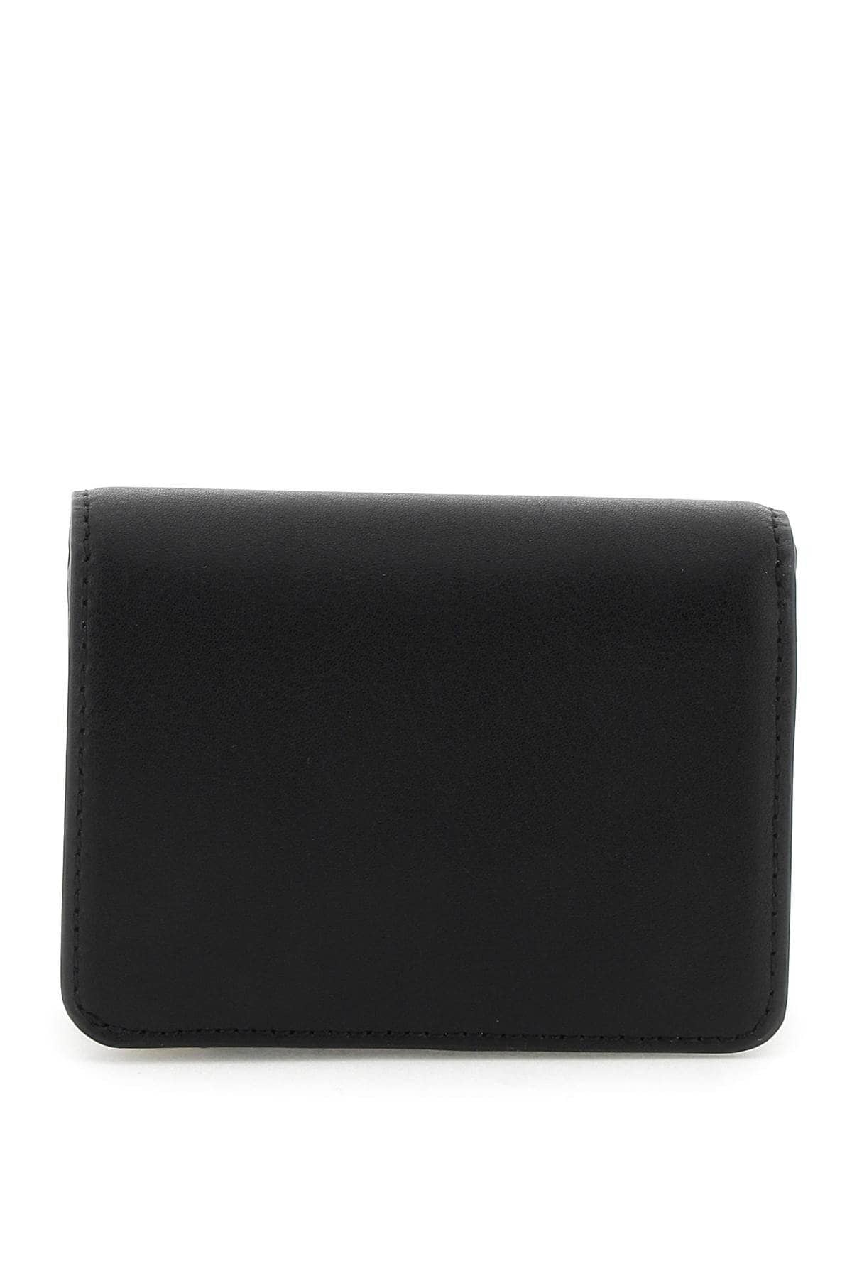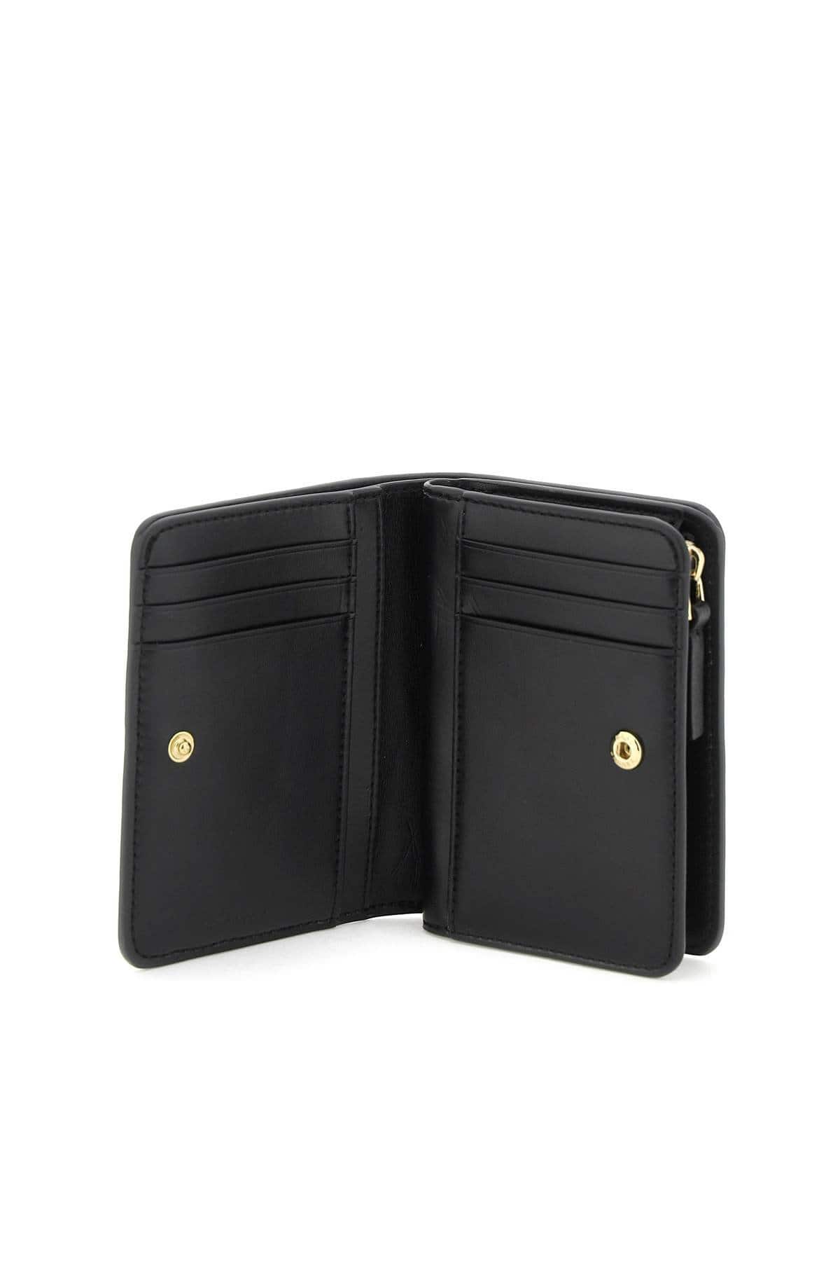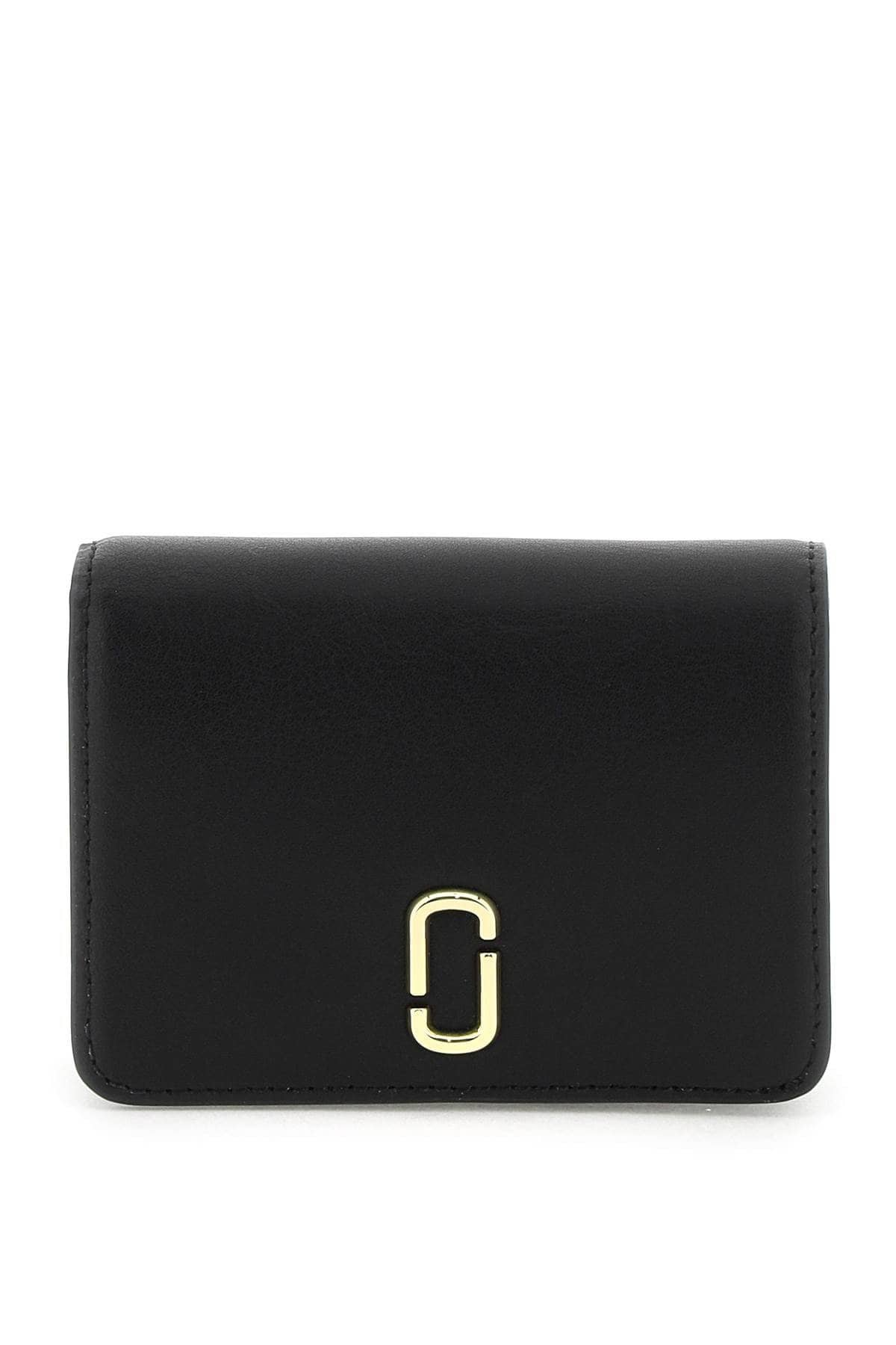 Marc Jacobs wallet crafted in smooth leather with gold metal monogram. Snap-button closure, bill compartment, six card slots, three slit pockets and zippered coin compartment.