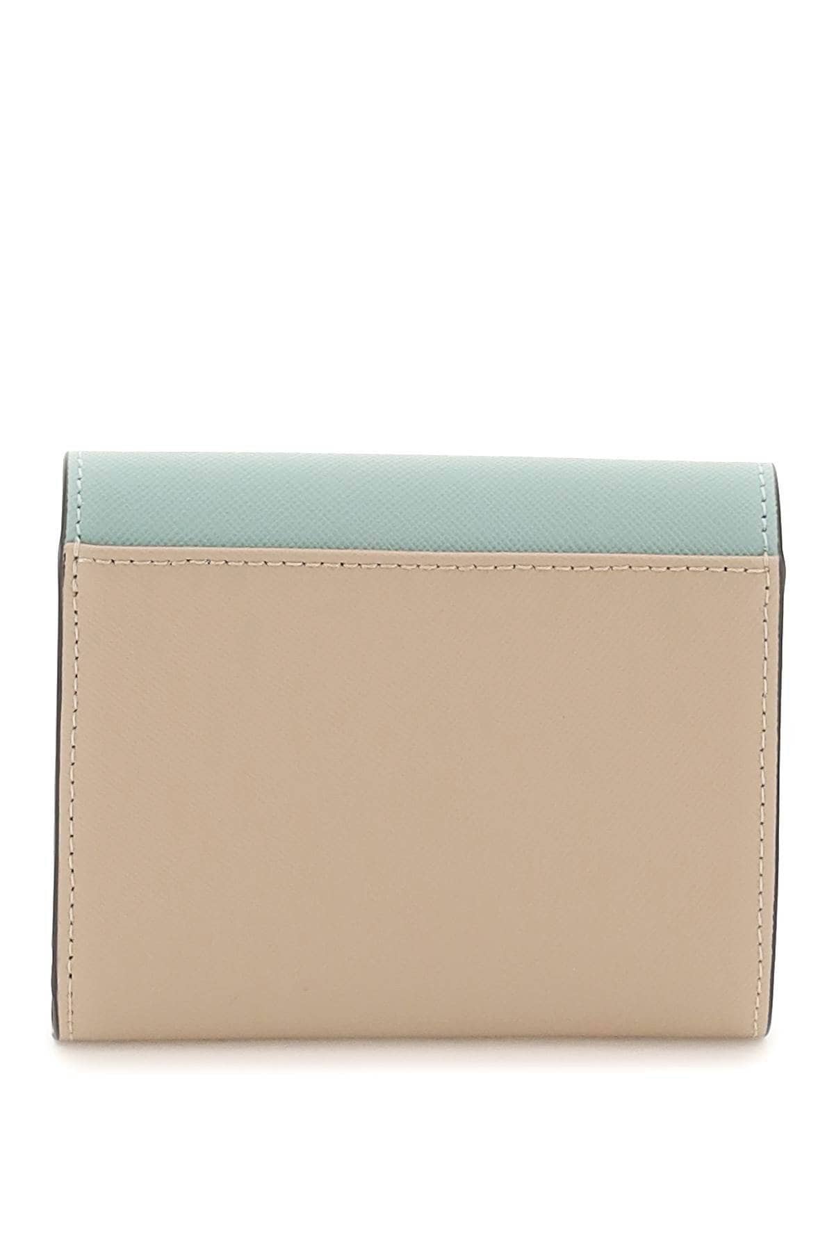Marni bi-fold wallet crafted in multicoloured saffiano leather, featuring flap with press-stud closure and gold-tone lettering logo print on front. Patch pocket under the flap, leather interior with a fabric-lined banknote compartment, four ticket pockets, four credit card slots and a zipped coin pocket. Gold-finished metalware.