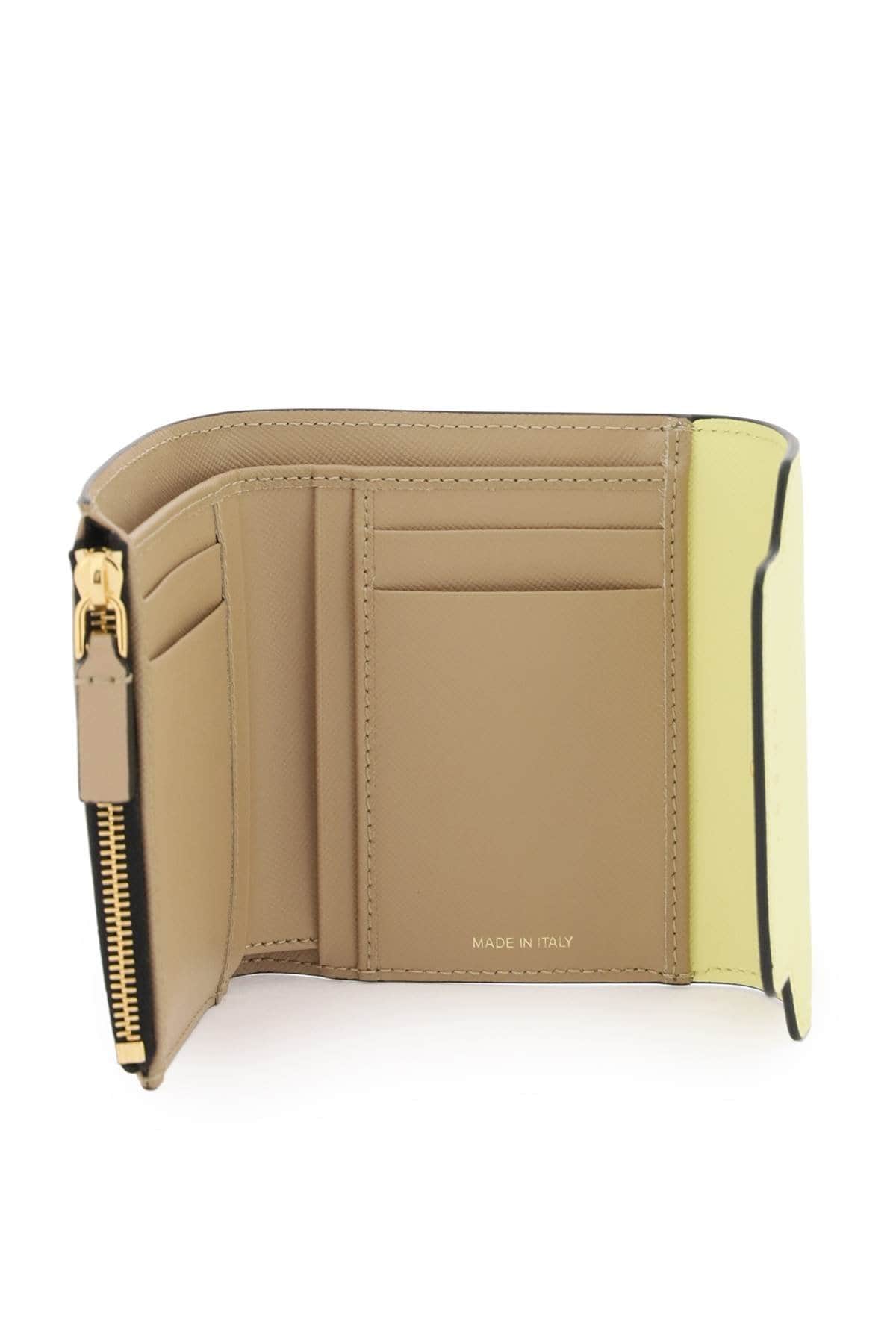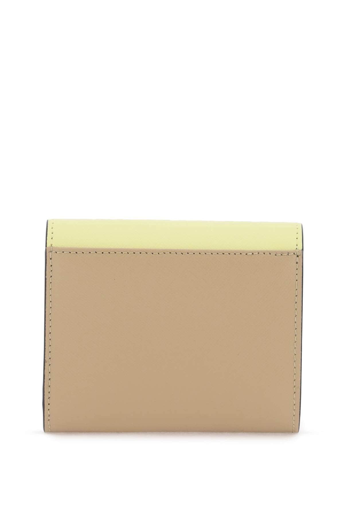Marni bi-fold wallet crafted in multicoloured saffiano leather, featuring flap with press-stud closure and gold-tone lettering logo print on front. Patch pocket under the flap, leather interior with a fabric-lined banknote compartment, four ticket pockets, four credit card slots and a zipped coin pocket. Gold-finished metalware.