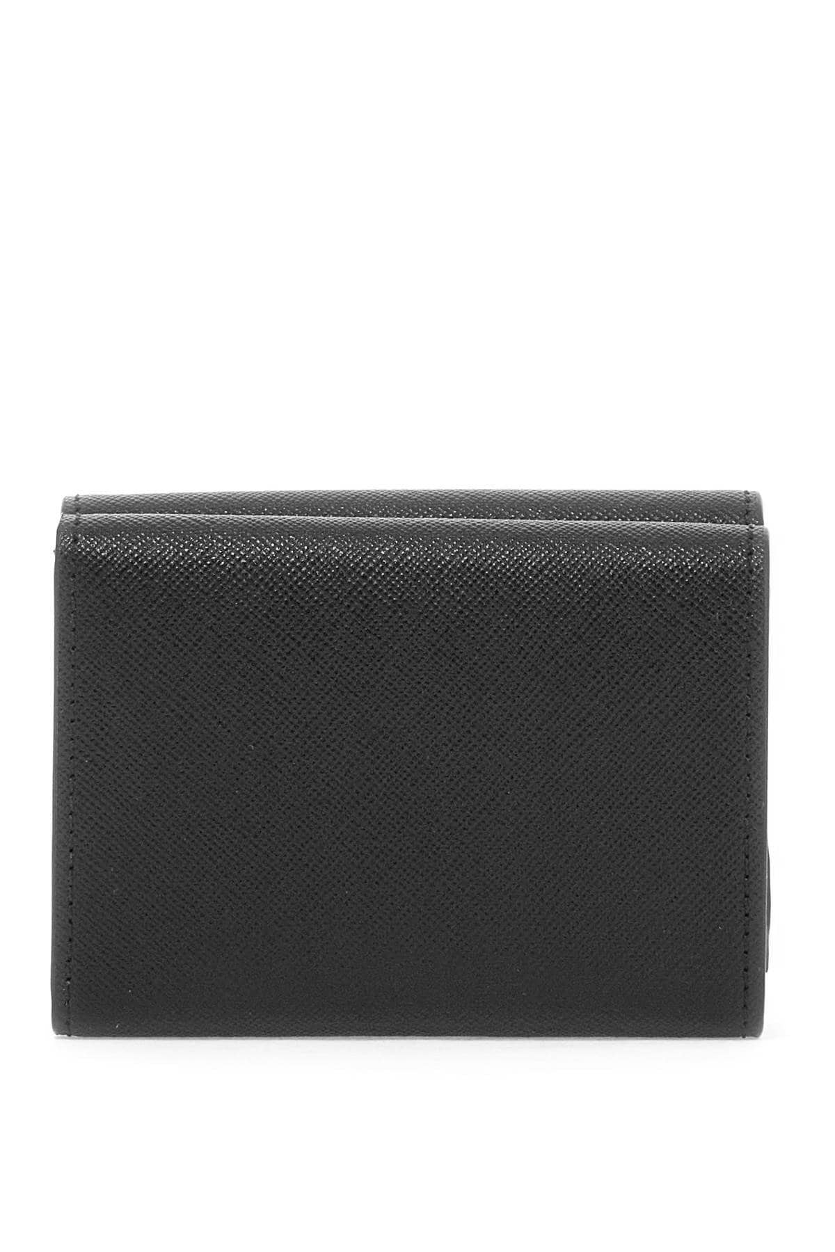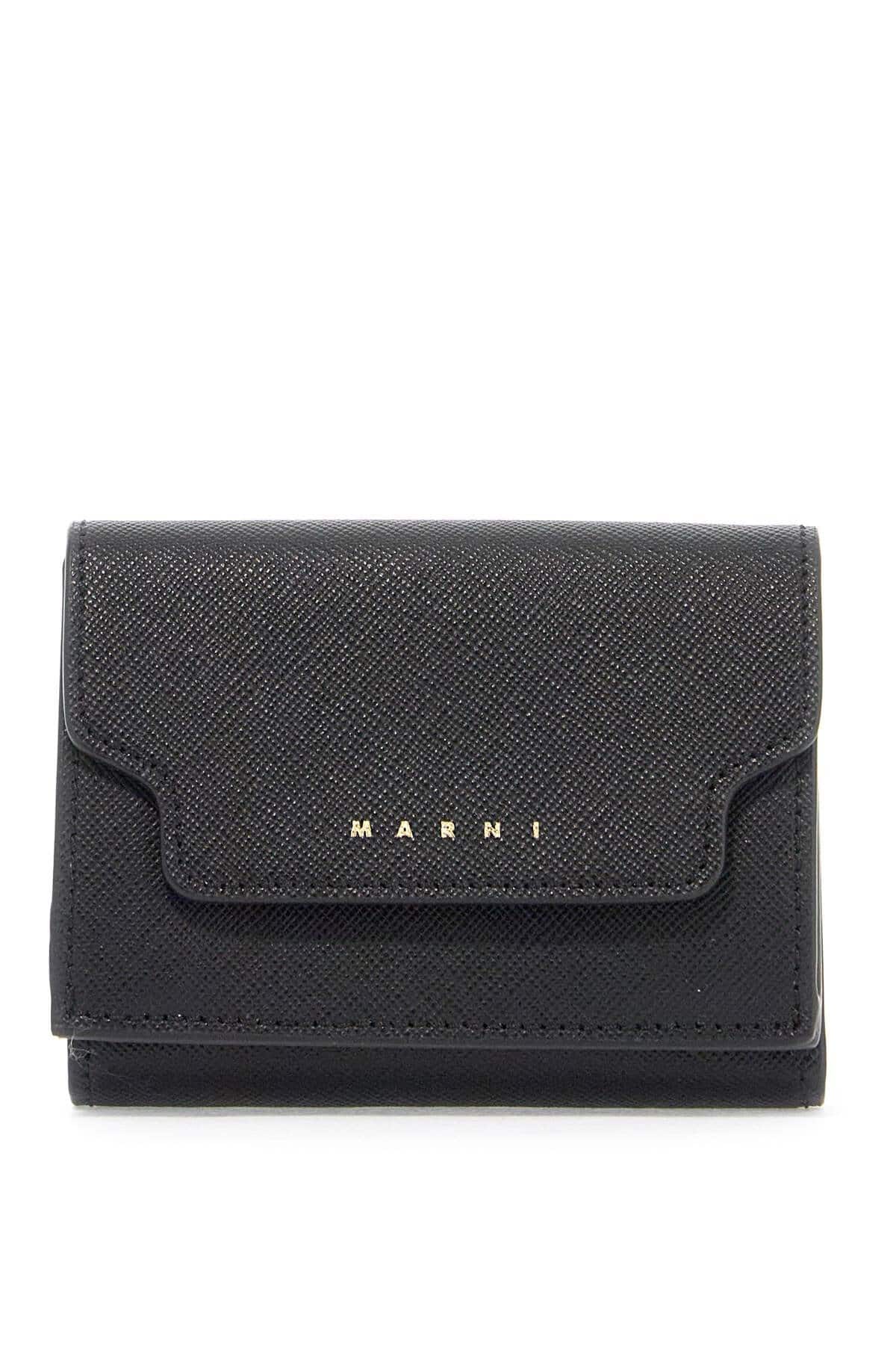 The Marni tri-fold wallet is made of saffiano leather and features a laminated logo closure on the coin pocket flap. It has a snap button closure, with a matching interior compartment for coins, four slip pockets, and six credit card slots.