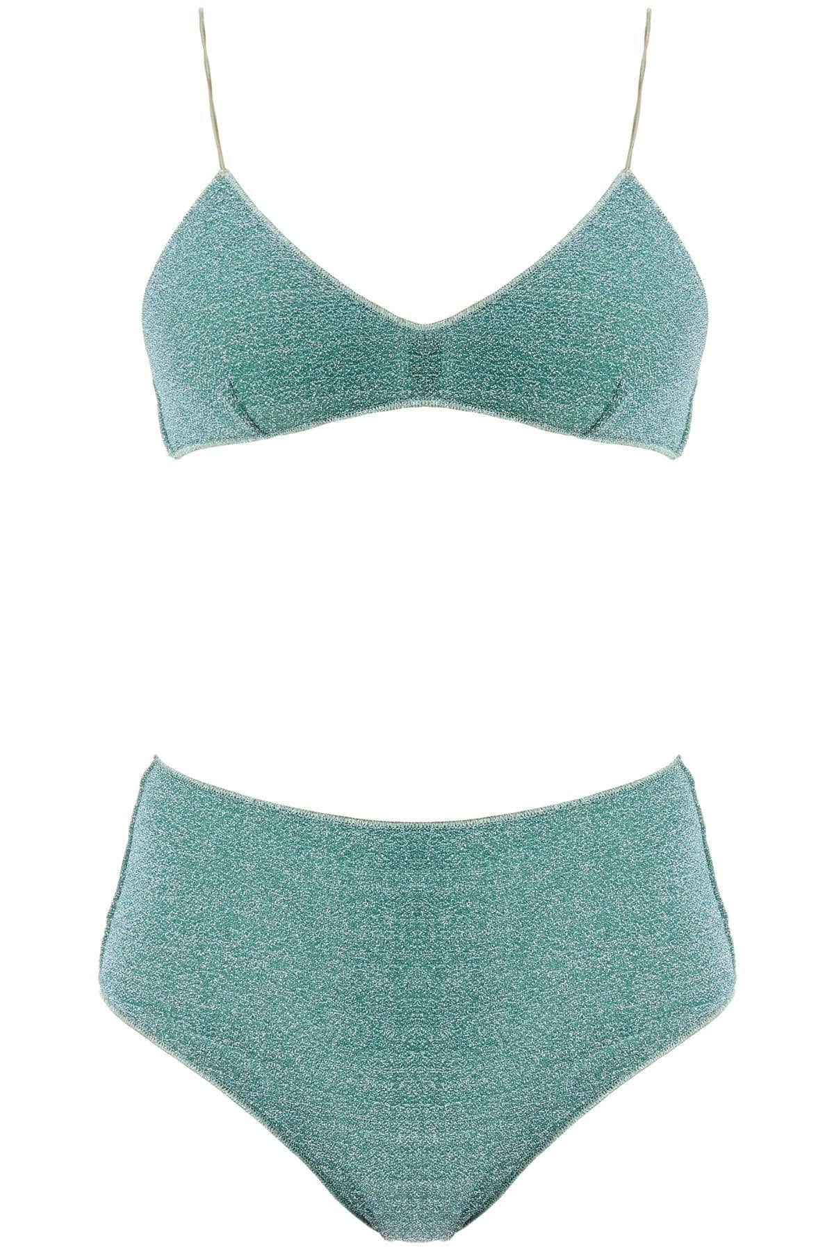 This Osé ree lycra lurex bikini set is composed of a top with thin straps and high-waisted bottoms. The back closure can be adjusted with strings. The model is 177 cm tall and wears size S.