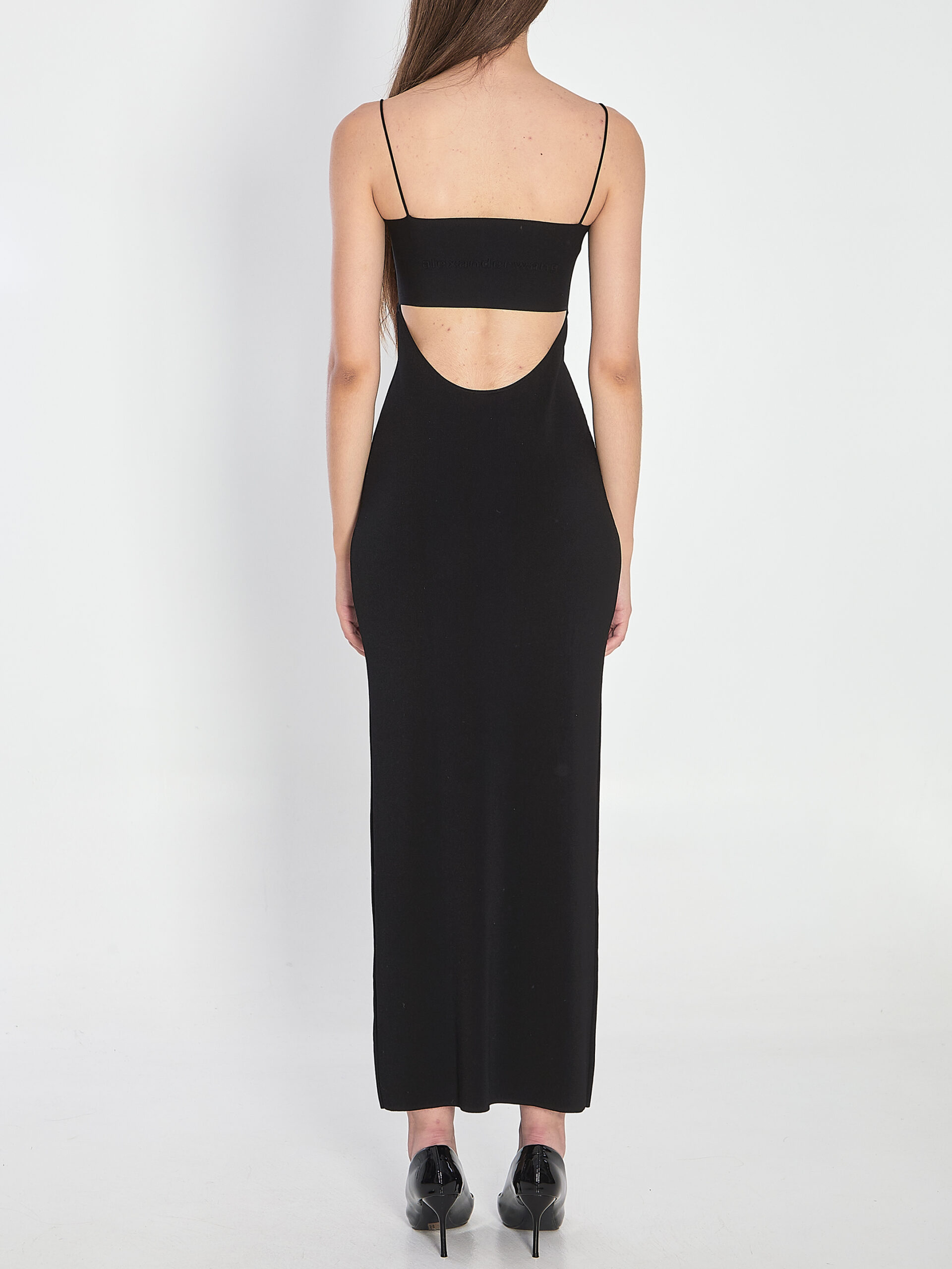 Black midi dress featuring thin shoulder straps, an elastic band with tone-on-tone Alexander Wang logo at the back, and a back slit. Slim fit.