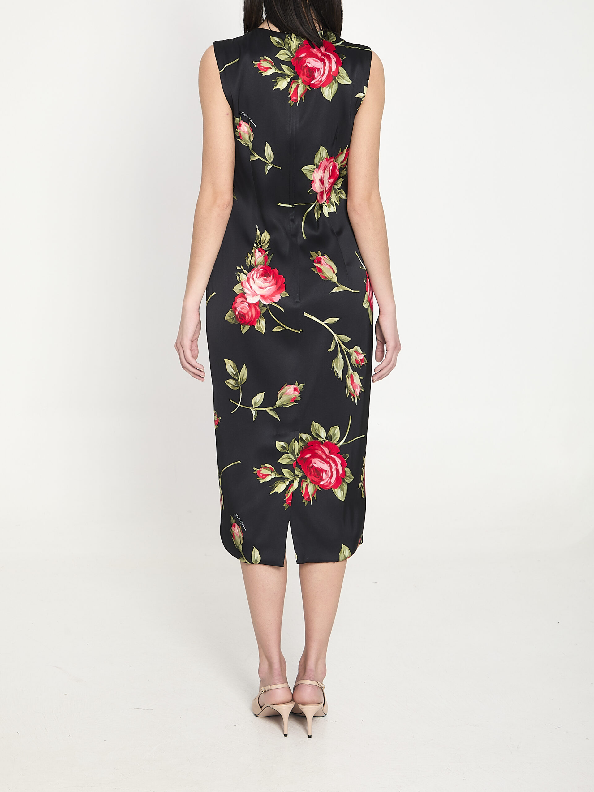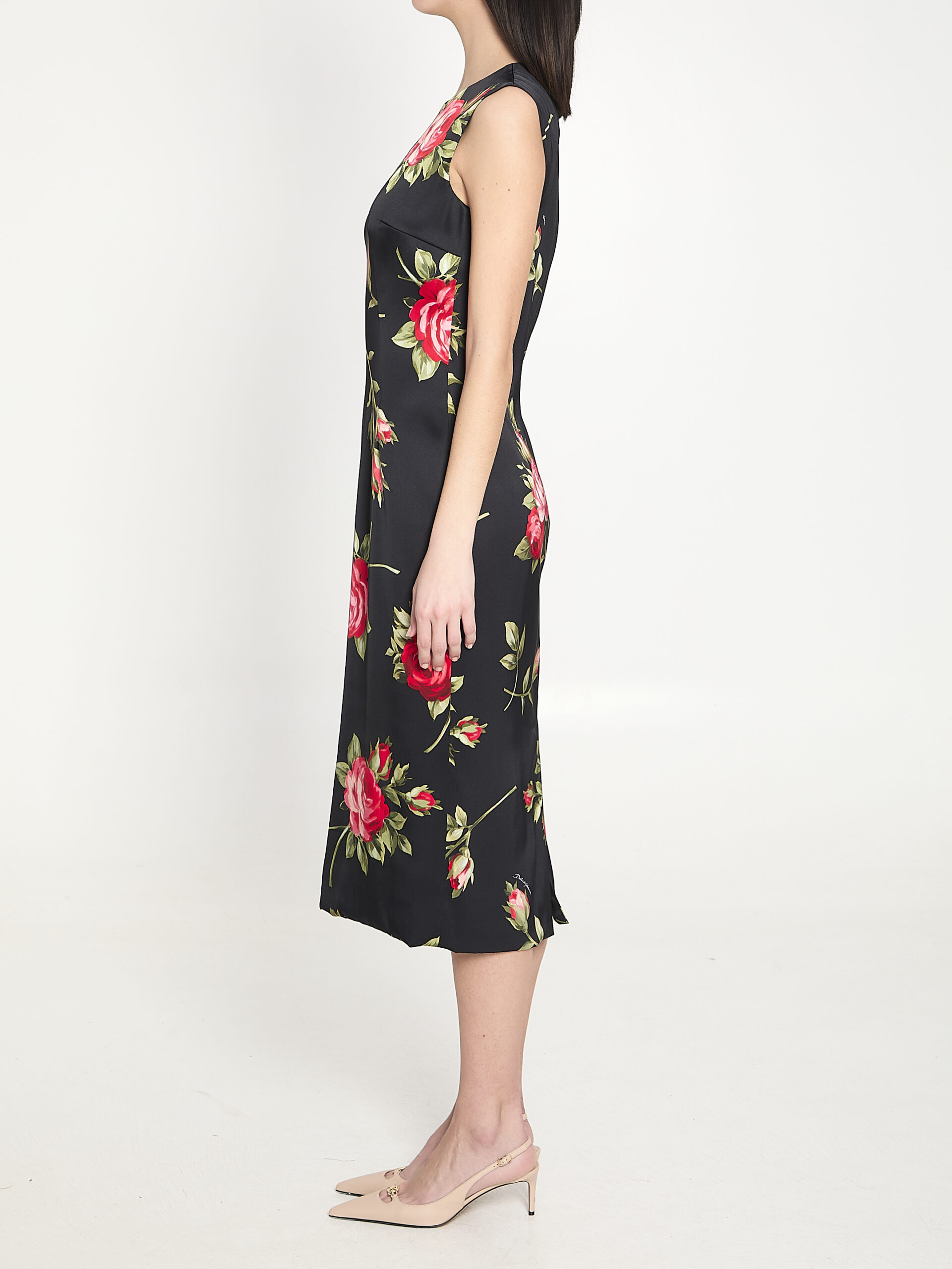 Black silk satin midi dress with a Bouquet rose print. Features a crewneck, back zipper closure, central back slit, nipped-in waist. Slim fit.