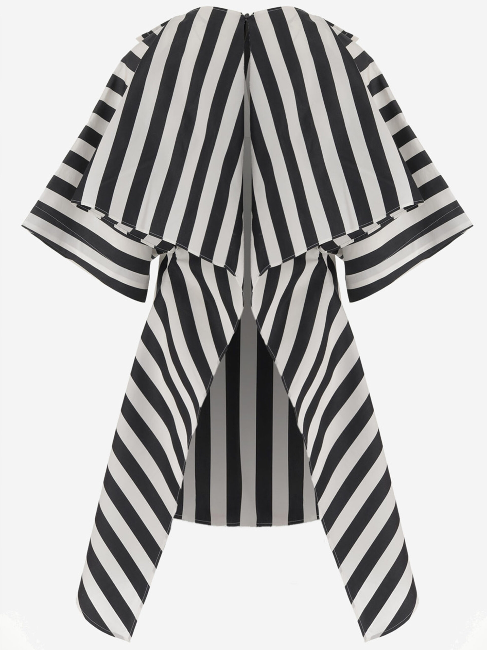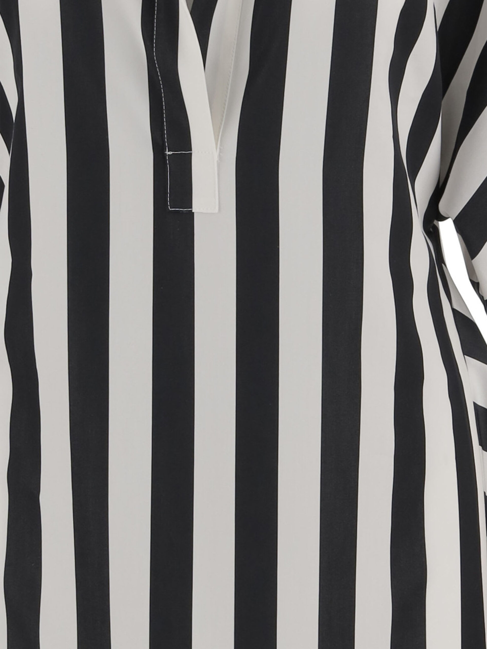 White and black striped cotton and silk tunic featuring a deep V-neck, wide short sleeves, and a button closure at the back. Open-back design. Comfortable fit.