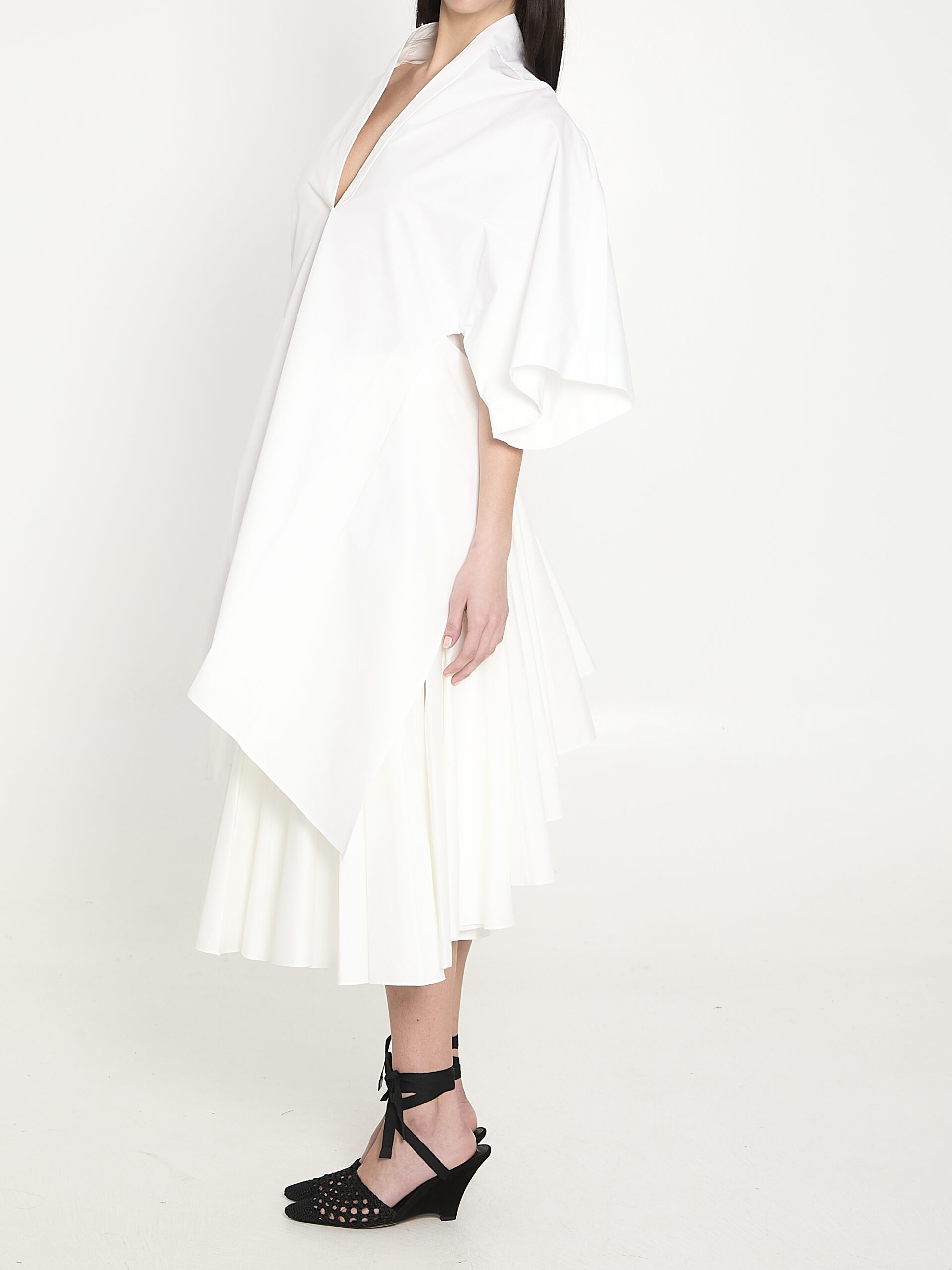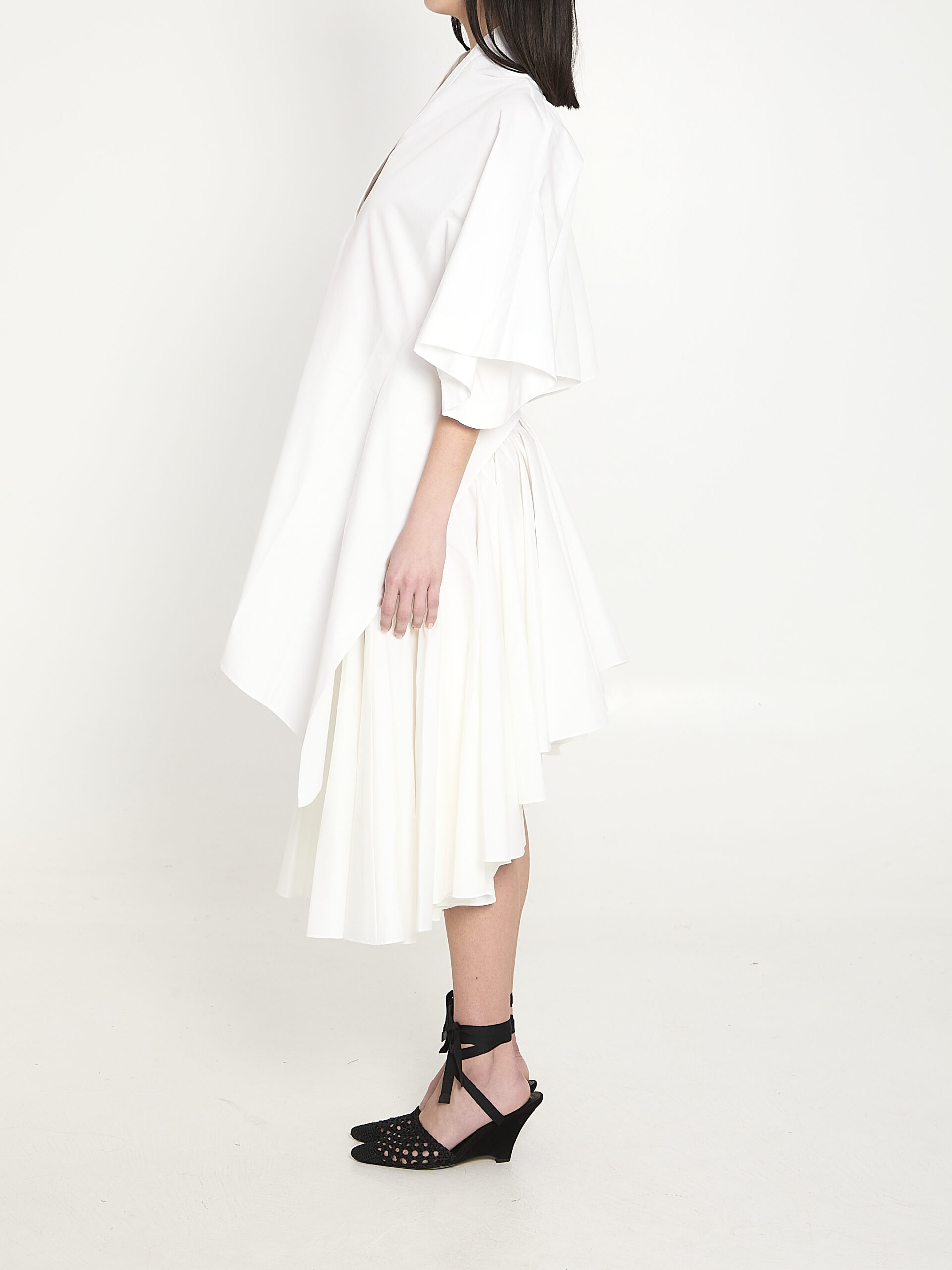 White technical cotton popeline midi tunic dress with back opening. Features an open polo neckline, wide short sleeves, button closure on the back, fully exposed back with draped panels on each side. Loose fit.