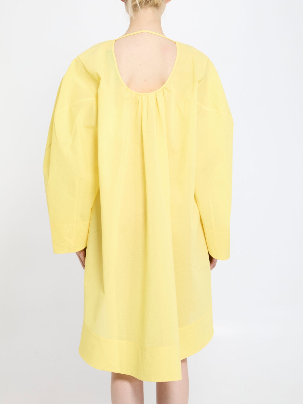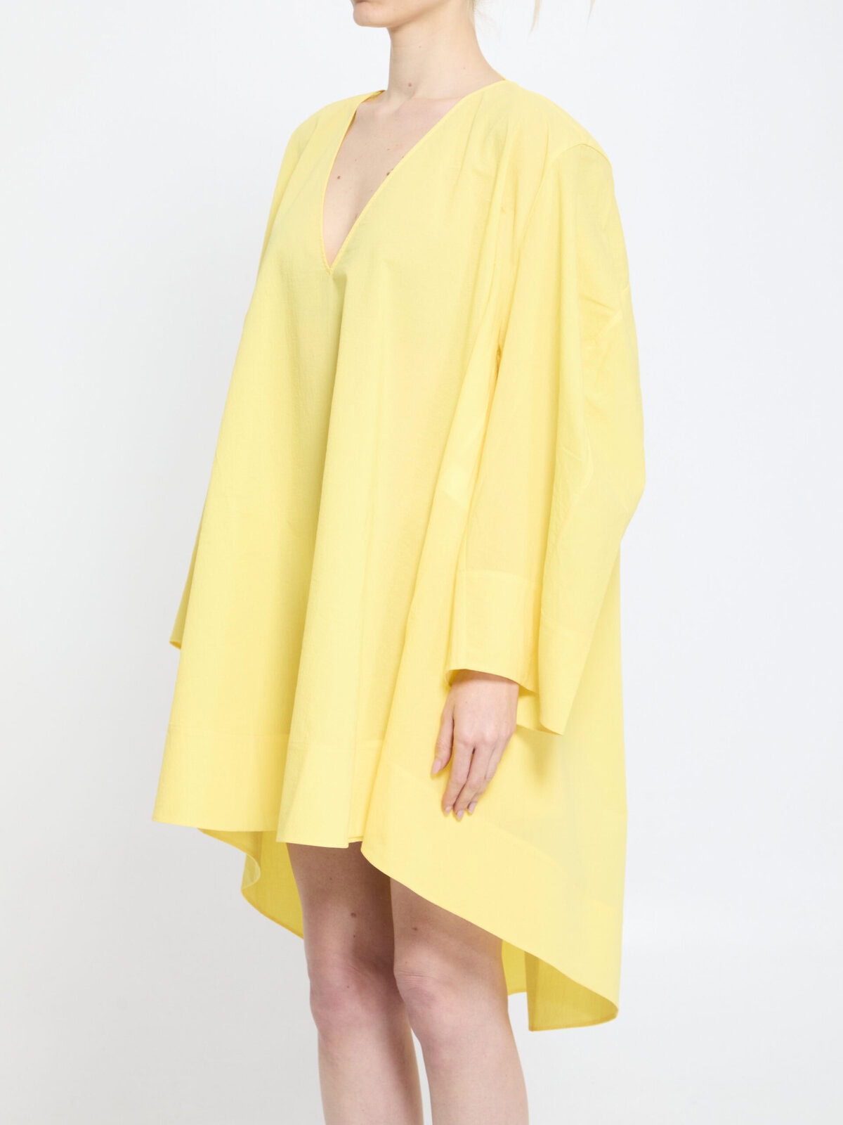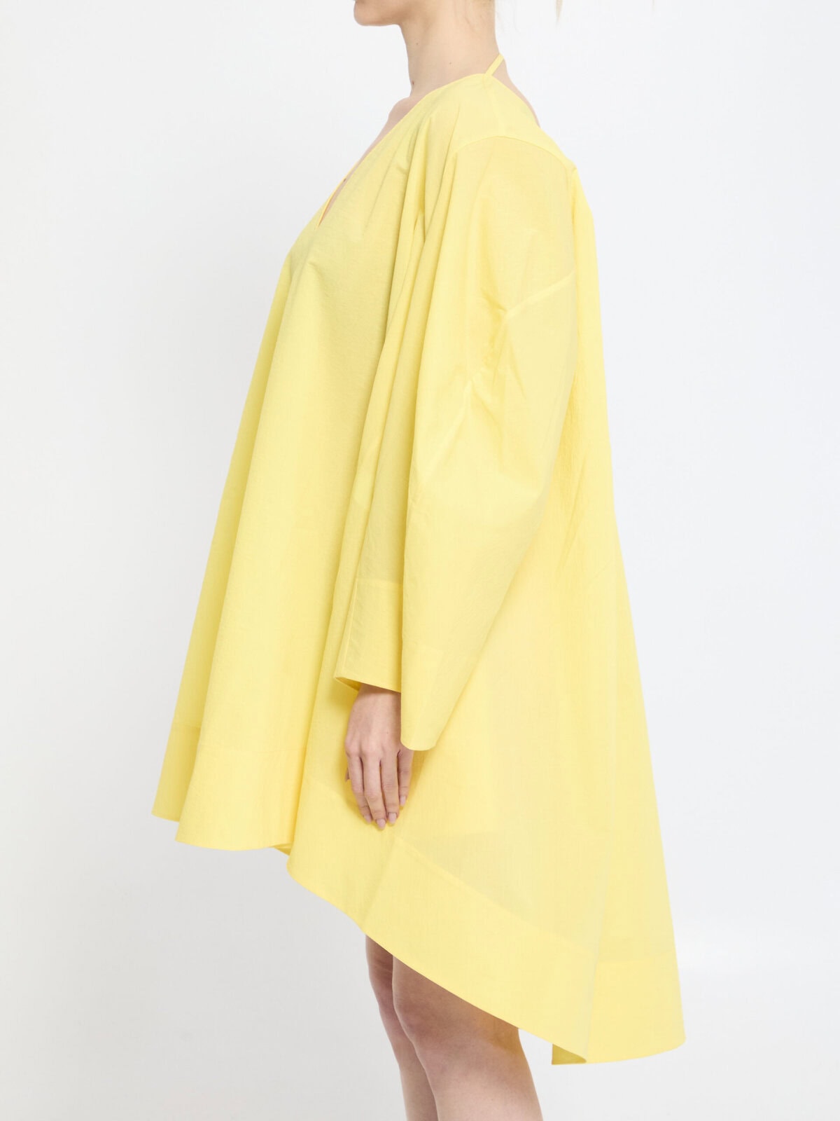 Tunic dress in textured sheer yellow cotton poplin. It features a deep V neckline, wide curved sleeves, a back neckline with a fastening strap, a flared mini hemline and knee length at the back. Relaxed fit.