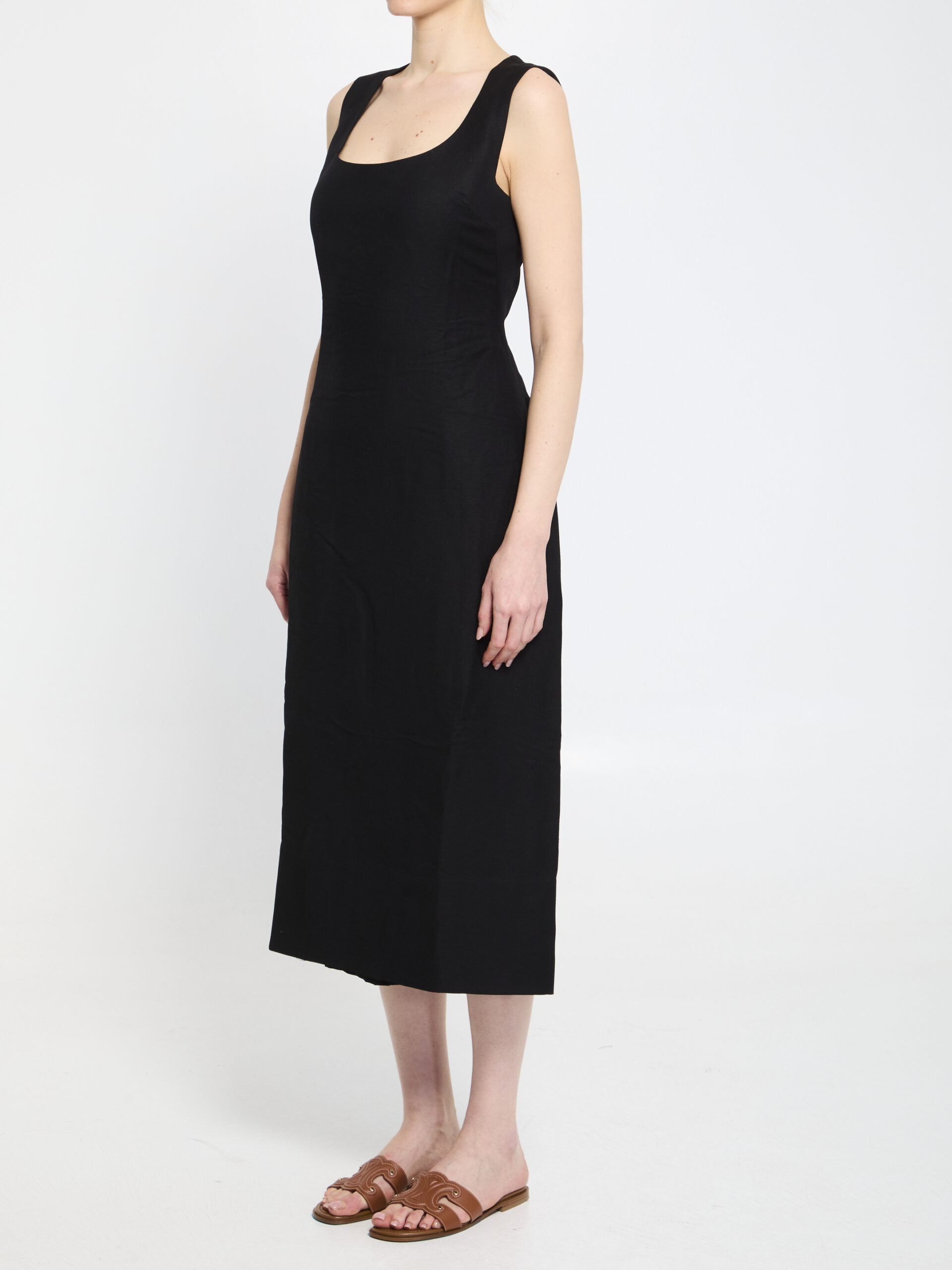 Black midi dress in linen and viscose. It features thin straps, a round neckline, a wide skirt, back zip and hook closure, a central back slit, polyester lining. Regular fit.